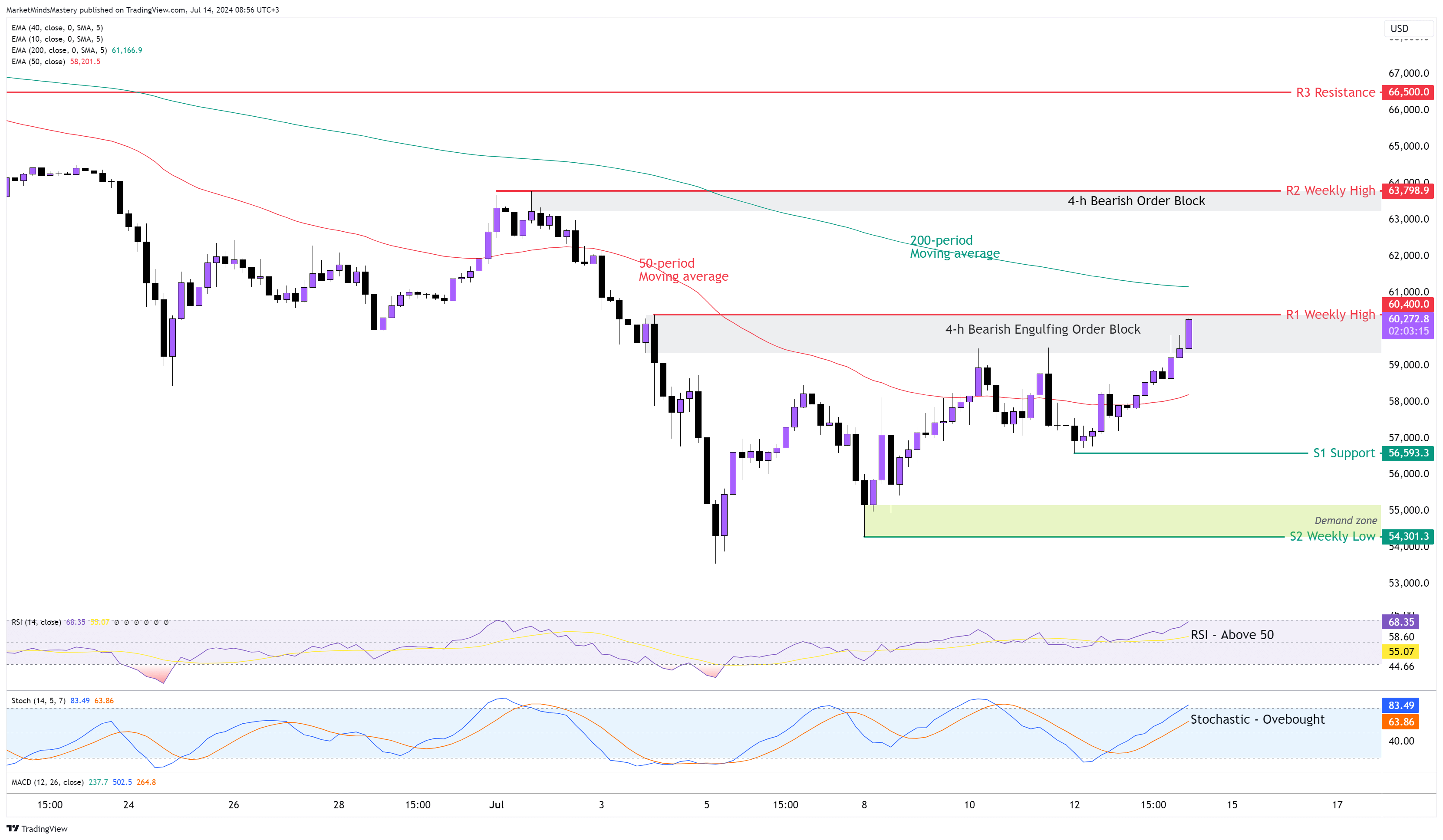 استنادًا إلى تحليل التأرجح، انتهى الاتجاه الهبوطي على الرسم البياني لفترة 4 ساعات حيث أنشأ السعر هيكلًا جديدًا للسوق مع ارتفاعات أعلى وقيعان أدنى. على الرغم من ذلك، لا يزال المتوسط المتحرك لـ أدنى من المتوسط المتحرك لـ 200 فترة، وهذا له ميل هبوطي لأنه يتبع الاتجاه الهبوطي المتوسط. يقع مؤشر ستوكاستيك مؤشر ستوكاستيك في حالة إفراط في الشراء، وهذا له آثار صعودية. في الوقت الحالي، يتم تداول السعر حاليًا داخل مربع 4-H Order Block، حول أعلى مستوى في الأسبوع السابق. إذا اخترق السعر مستوى 60400$، وهو القمة السابقة، والذي يظهر على الرسم البياني على شكل R1 وتحرك لأعلى، فإن منطقة المقاومة التالية، R2، ستكون منطقة المقاومة التالية R2 هي القمة الأسبوعية القديمة عند 63800$ تقريبًا. إذا تحرك السعر لأعلى سيجد المقاومة التالية، R3، حول 66500 دولار.