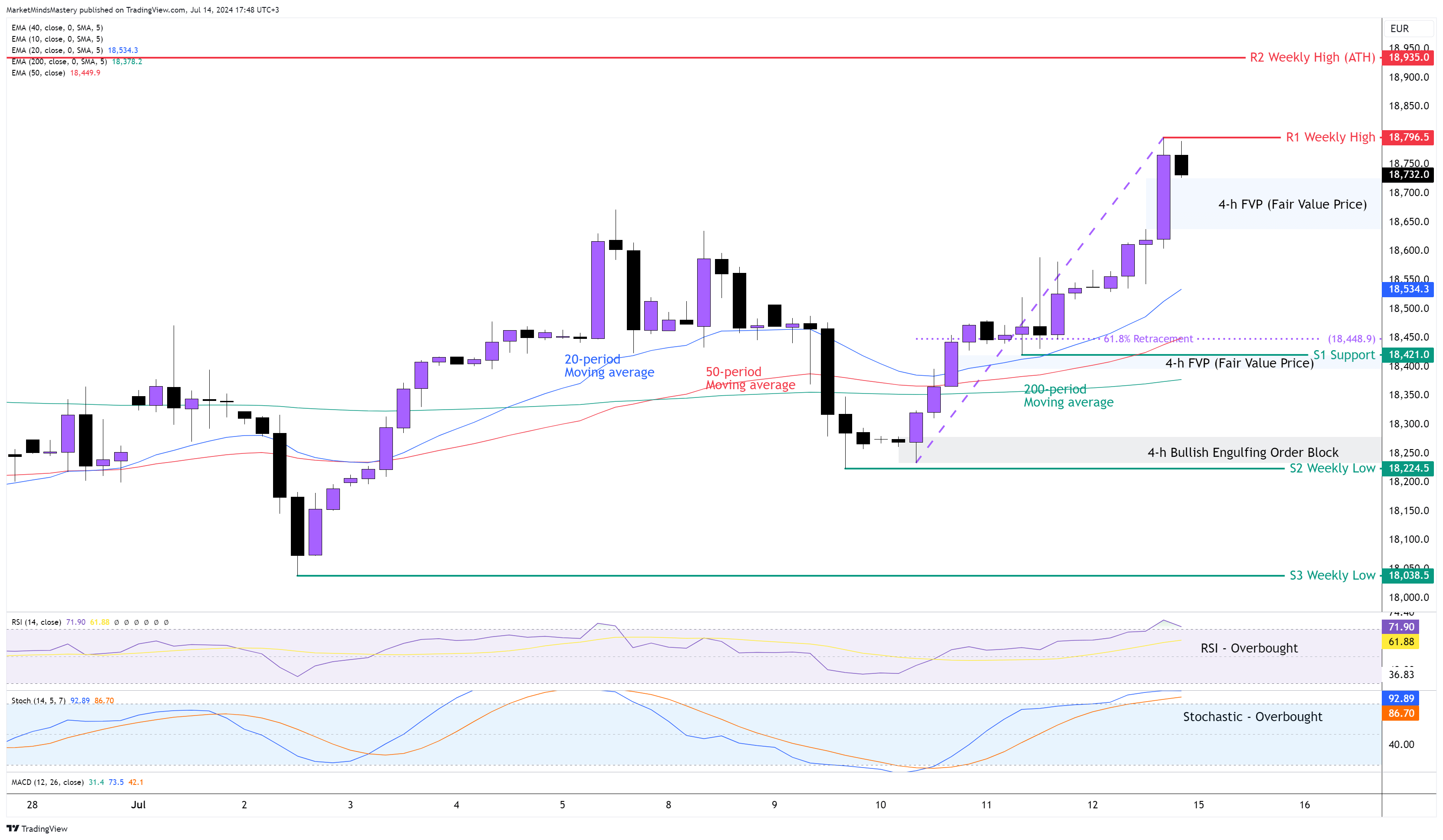 من ناحية أخرى، إذا استمر السعر في التحرك لأعلى، ستكون منطقة المقاومة الأولى، R1، هي قمة الأسبوع السابق حول 18796. هذا المستوى السعري قريب جدًا من إغلاق الشمعة الأسبوعية الأخيرة. في حالة اختراق السعر لمستوى R1 واستمراره في الصعود، ستكون منطقة المقاومة التالية، R2، هي ATH (أعلى مستوى على الإطلاق) حول 18935.