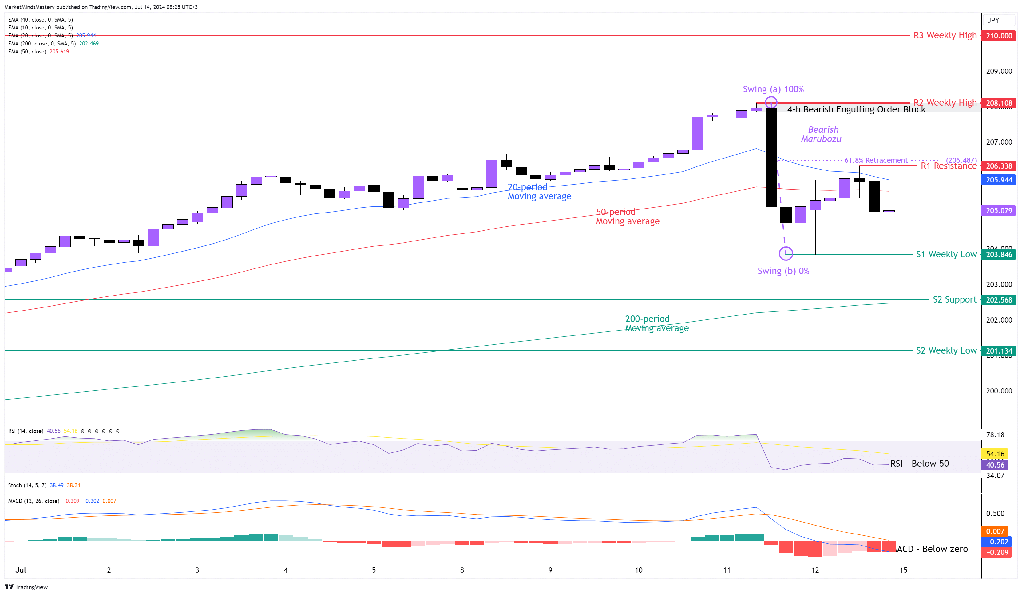 بعد الاتجاه الصعودي الذي شهده الأسبوع السابق، استمر السوق في الارتفاع، واستمر السعر في تحقيق قمم وقيعان مرتفعة على الرسم البياني الأسبوعي. ومع ذلك، انتهت الشمعة الأسبوعية على الرسم البياني الأسبوعي على شكل Doji. نظرًا لأن هذا يحدث بعد اتجاه صعودي واسع النطاق، فإن نمط حركة السعر الأسبوعي هذا يمكن أن يضع السوق في مرحلة ارتداد هبوطي. قبل ذلك، أجبرت التباعدات السلبية لمدة 4 ساعات، بناءً على توقعات السوق للأسبوع السابق، السعر على الدخول في مرحلة تصحيحية على مدى 4 ساعات كما هو متوقع. كسرت شمعة ماروبوزو الهبوطية التي تم إنشاؤها يوم الخميس الماضي هيكل السوق على الرسم البياني للأربع ساعات. استنادًا إلى تحليل التأرجح، إذا تم اختراق التأرجح عند النقطة (ب)، فسيتبع ذلك اتجاه هابط لمدة 4 ساعات. لا تزال فترة 20 ساعة أعلى من المتوسط المتحرك لـ 50 ساعة، وهذا له آثار صعودية. ومع ذلك، فإن مؤشر القوة النسبية تحت الصفر، وهذا يشير إلى زخم سعري هابط. مؤشر الماكد والمخطط البياني للهيستوجرام كلاهما تحت الصفر، وهذا أمر هبوطي. في يوم الجمعة الماضي، تم رفض السعر يوم الجمعة الماضي حول المتوسط المتحرك لـ 20 فترة ومستوى فيبوناتشي 61.8% وتحرك للأسفل. إذا استمر في الحركة الهبوطية، ستكون منطقة الدعم الأولى، S1، هي قاع الأسبوع السابق، حول مستوى 203.846. إذا اخترق S1 وانخفض أكثر من ذلك، فإن منطقة الدعم التالية، S2، ستكون حوالي 202.56. ويقع المتوسط المتحرك لفترة 200 فترة حول نفس مستوى السعر تقريبًا، ويمكن أن يكون عامل دعم إضافي لإيقاف السعر من التحرك لأسفل. من ناحية أخرى، إذا استأنف السعر الاتجاه الصعودي الأساسي ، فإن منطقة المقاومة الأولى، R1، ستكون 206.338. إذا اخترق R1 وواصل الصعود، فستكون المقاومة التالية، R2، هي قمة الأسبوع السابق، حول 208.108.