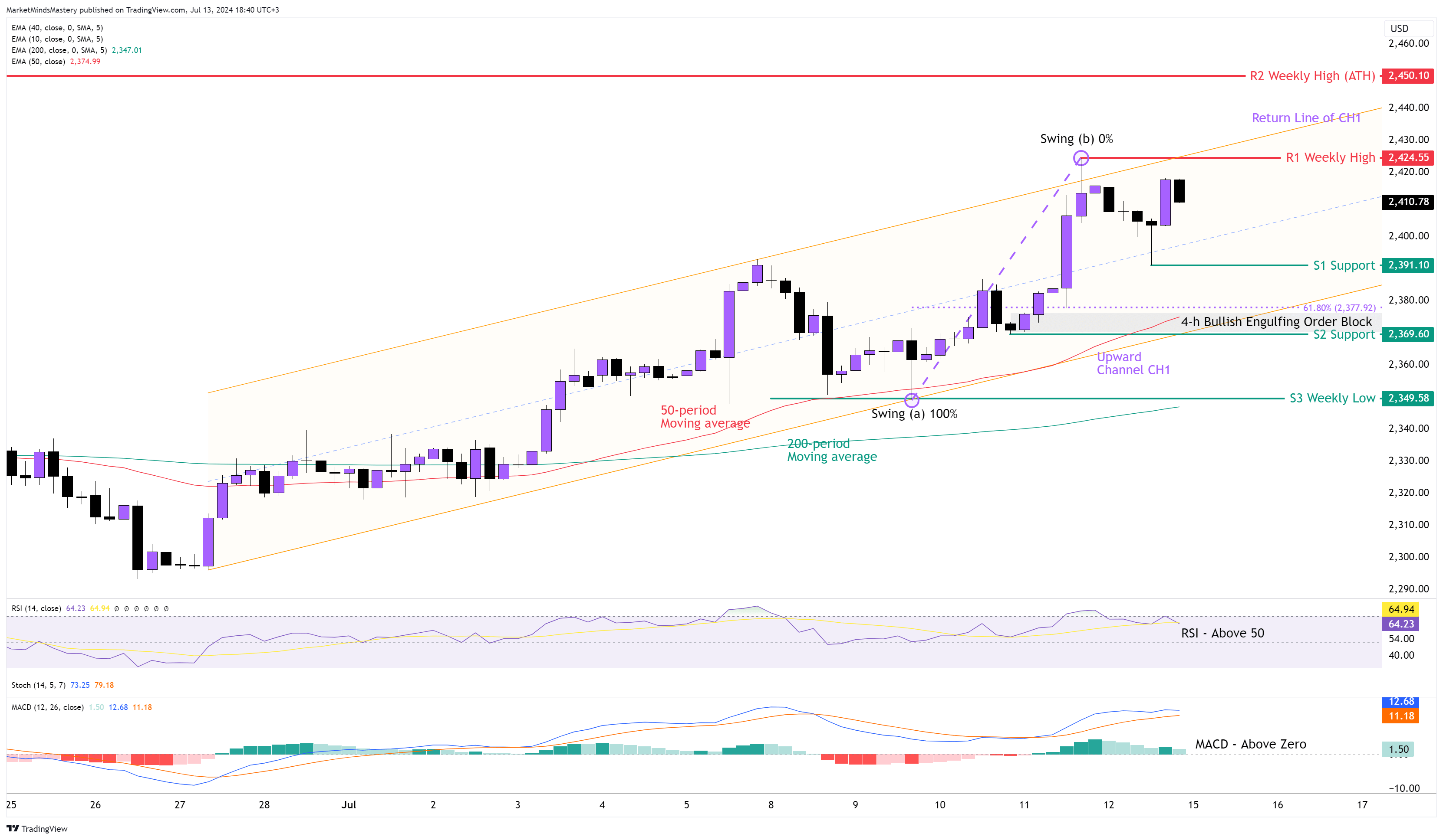 على الرسم البياني للأسبوع، انتهى السعر الأسبوع الماضي على شكل شمعة صاعدة مع فتيل سفلي طويل. ويقترب السعر من السعر من (أعلى مستوى على الإطلاق)، مما يجعل هذا الأسبوع واعدًا جدًا للذهب. يسجل السعر على الرسم البياني لفترة 4 ساعات أعلى القمم والقيعان المرتفعة، مما يشير إلى اتجاه صعودي قوي. يقع مؤشر فوق المتوسط المتحرك لـ ، وهذا يشير إلى الاتجاه الصعودي. ويتحرك السعر حاليًا داخل القناة الصاعدة CH1 ، ويقترب السعر الحالي من خط الرجوع، كما هو موضح في الرسم البياني. مؤشر RSI المذبذب فوق مستوى 50 وقريب جدًا من منطقة الإفراط في الشراء، وهي علامة على قوة السوق. ويقع مؤشر MACD فوق خط الصفر، وهذا له آثار صعودية. إذا استمر السعر في حركته الصعودية فإن منطقة المقاومة الأولى، R1، ستكون أعلى مستوى في الأسبوع السابق، حوالي 2424 دولارًا. إذا اخترق السعر R1 وأغلق في نفس الوقت فوقها، فإن منطقة المقاومة التالية، R2، ستكون منطقة المقاومة التالية، R2، هي ATH عند 2450 دولارًا.