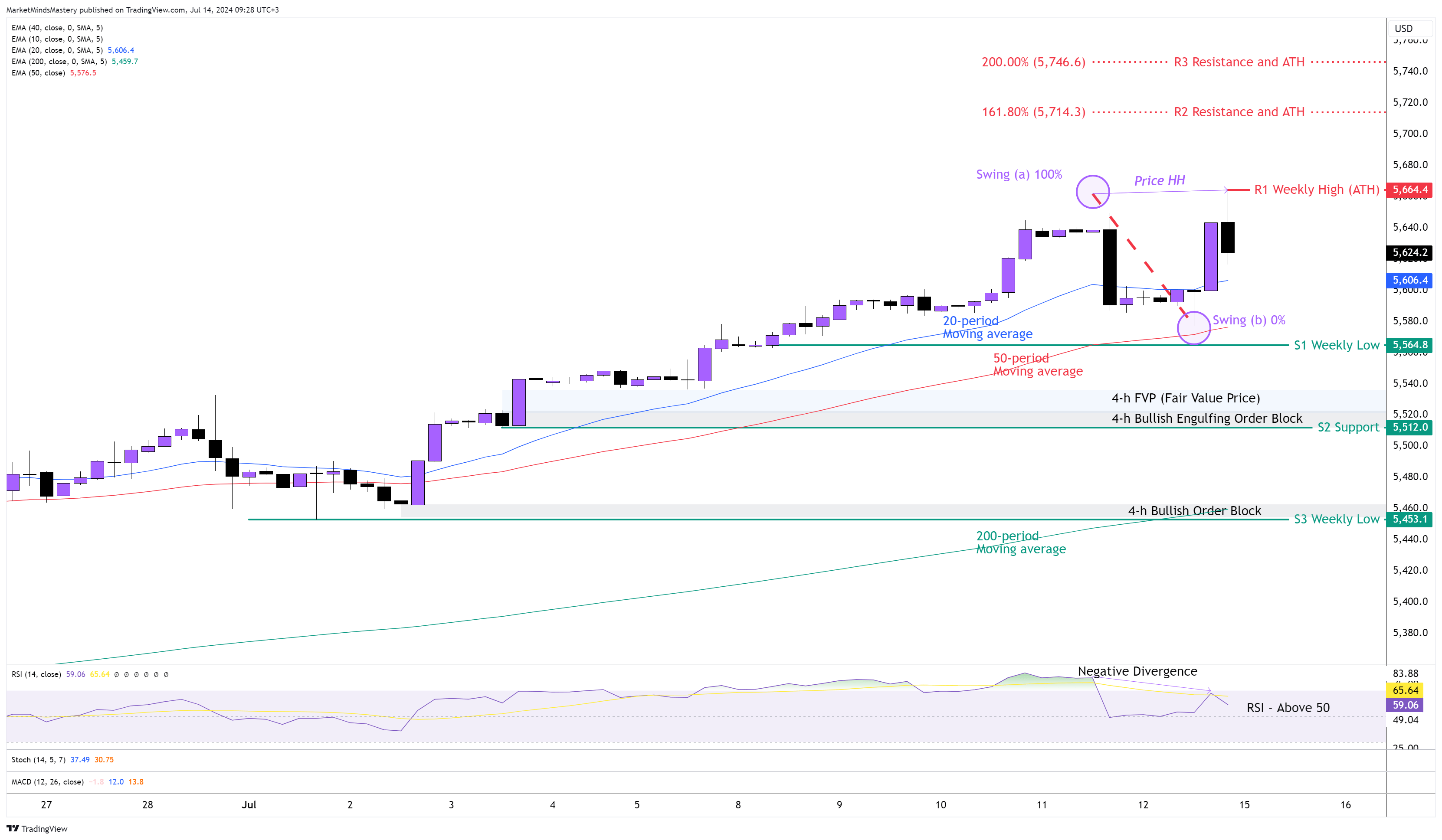من ناحية أخرى، إذا تحرك السعر لأعلى، فإن منطقة المقاومة الأولى، R1، ستكون منطقة المقاومة الأولى R1 هي ATH الأسبوع الماضي حول 5664 دولارًا. ستؤدي الحركة الصعودية الإضافية إلى استمرار الاتجاه الصعودي الحالي وإنشاء ATH جديد;
