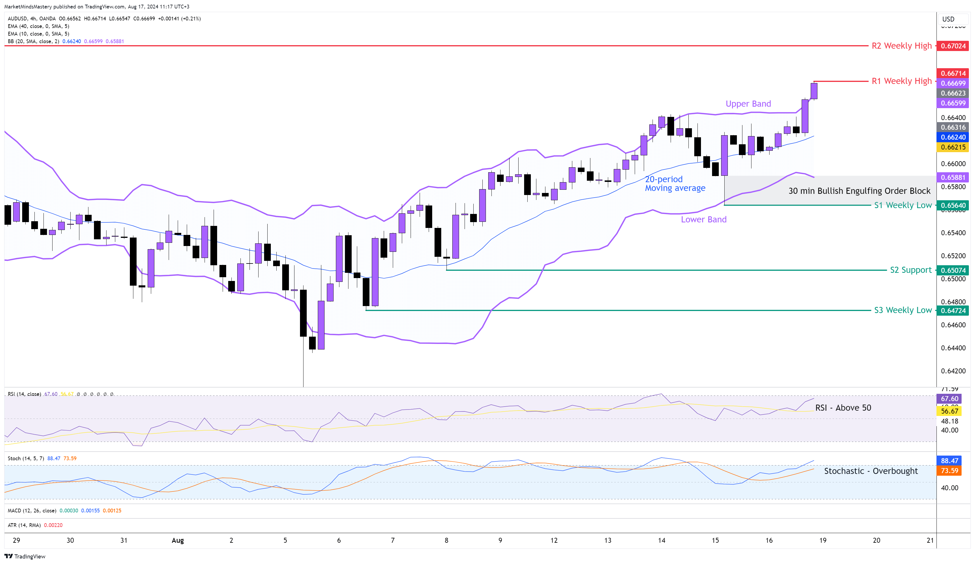 استنادًا إلى التحليل الفني ومعلومات حركة السعر، كان زوج الدولار الأسترالي/الدولار الأمريكي أحد أكثر أزواج العملات التي يمكن التنبؤ بها خلال الأسبوع الماضي. إن حركة السعر مع حركة السعر مع رفض "الفتيل السفلي الطويل" لمستوى دعم كبير جعلته تحيزًا اتجاهيًا مثاليًا لمدخلات الشراء في المقام الأول على الأطر الزمنية الأدنى. وبسبب ذلك، تحرك الرسم البياني للأربع ساعات لأعلى في تشكيل دوري، مما يعني أنه خلق ارتفاعات أعلى وقيعان أعلى باستخدام مؤشر بولينجر باند، اخترق السعر فوق النطاق العلوي، وفي الوقت نفسه، تحول السُّفلي إلى الأسفل، وأشار السُّفلي إلى الأعلى. هذه علامة على حدوث اختراق حقيقي، مما يلغي فرص أن يكون هذا اختراقًا زائفًا. الخط الأوسط لمؤشر بولينجر باند هو المتوسط المتحرك لـ 20 فترة. يقع مؤشر "RSI" فوق خط الوسط 50، وهو صعودي. مؤشر ستوكاستيك فوق حده العلوي عند 80، مما يشير إلى حالة السوق في منطقة ذروة الشراء. وبدءًا من يوم الاثنين، إذا استمر السعر في التحرك صعودًا، ستكون منطقة المقاومة الأولى R1 هي قمة الأسبوع السابق حول 0.66714. إذا اخترق السعر فوق R1 وواصل التحرك لأعلى، ستكون منطقة المقاومة التالية، R2، هي القمة الأسبوعية الأقدم عند 0.67024.