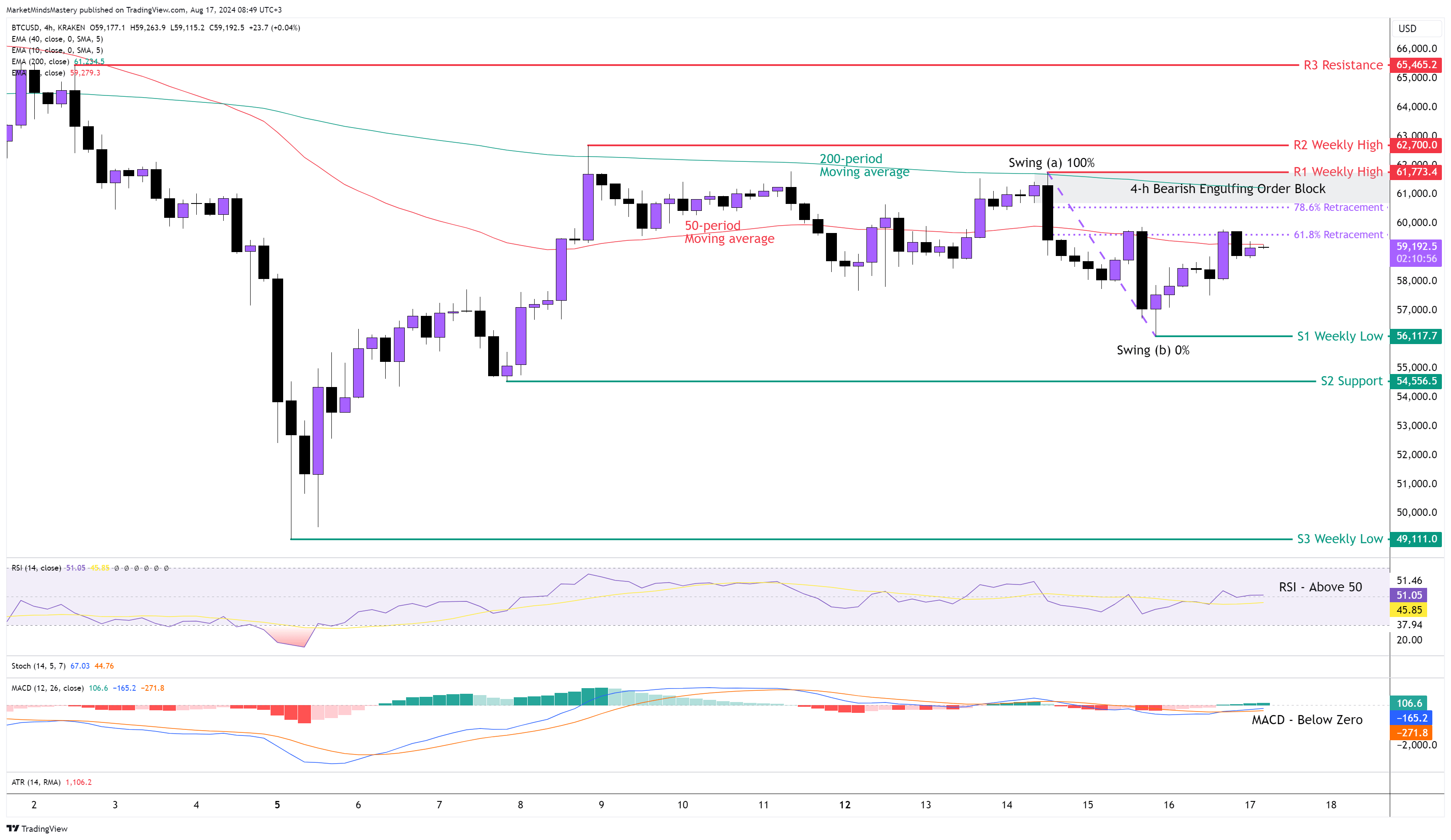 من ناحية أخرى، إذا كان اختلال توازن أوامر البيع والشراء في صالح جانب الشراء، فسوف يتحرك السعر لأعلى، وستكون منطقة المقاومة الأولى، R1، حوالي 61773 دولارًا. يتعايش هذا المستوى مع المتوسط المتحرك لـ 200 فترة. تم تشكيل "كتلة أوامر الابتلاع الهبوطية" يوم الأربعاء الماضي عند حوالي 61000 دولار، والتي يمكن أن تكون شكلاً آخر من أشكال المقاومة للسعر.