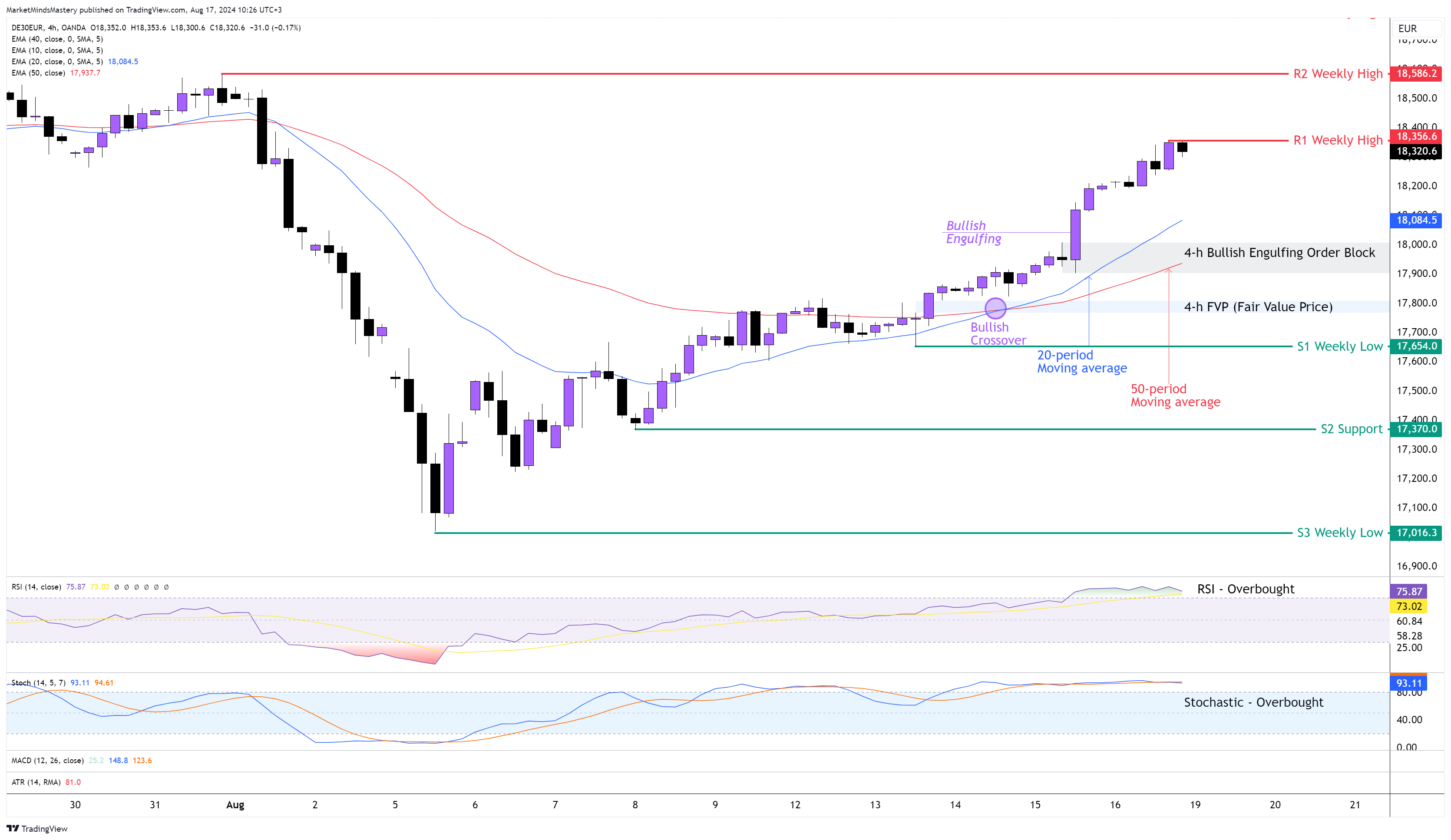 تحرك سعر GER30 لأعلى خلال الأسبوع الماضي، وانتهى الأسبوع على الرسم البياني الأسبوعي على شكل "ماروبوزو صاعد". على الرسم البياني للأربع ساعات، استمر السعر في الارتفاع، مكونًا قممًا مرتفعة وقيعانًا مرتفعة دون أي ارتدادات. كانت غالبية الشموع صاعدة، ولم يكن هناك سوى عدد قليل من الشموع الهابطة. وهذه علامة على اتجاه صعودي قوي. يوم الأربعاء، حدث تقاطع صعودي يوم الأربعاء، مما يعني أن المتوسط المتحرك لـ 20 فترة قد عبر فوق فترة 50، ومنذ ذلك الحين، دخل كل من مؤشر القوة النسبية ومؤشر ستوكاستيك في ظروف "أوفربوينت" الخاصة بهما. نظرًا لأن قمة التأرجح لم يتم تأكيدها، لا يمكننا استخدام أداة فيبوناتشي ريترسي لرسم مستويات ارتداد الحركة الصعودية الاندفاعية الأخيرة.