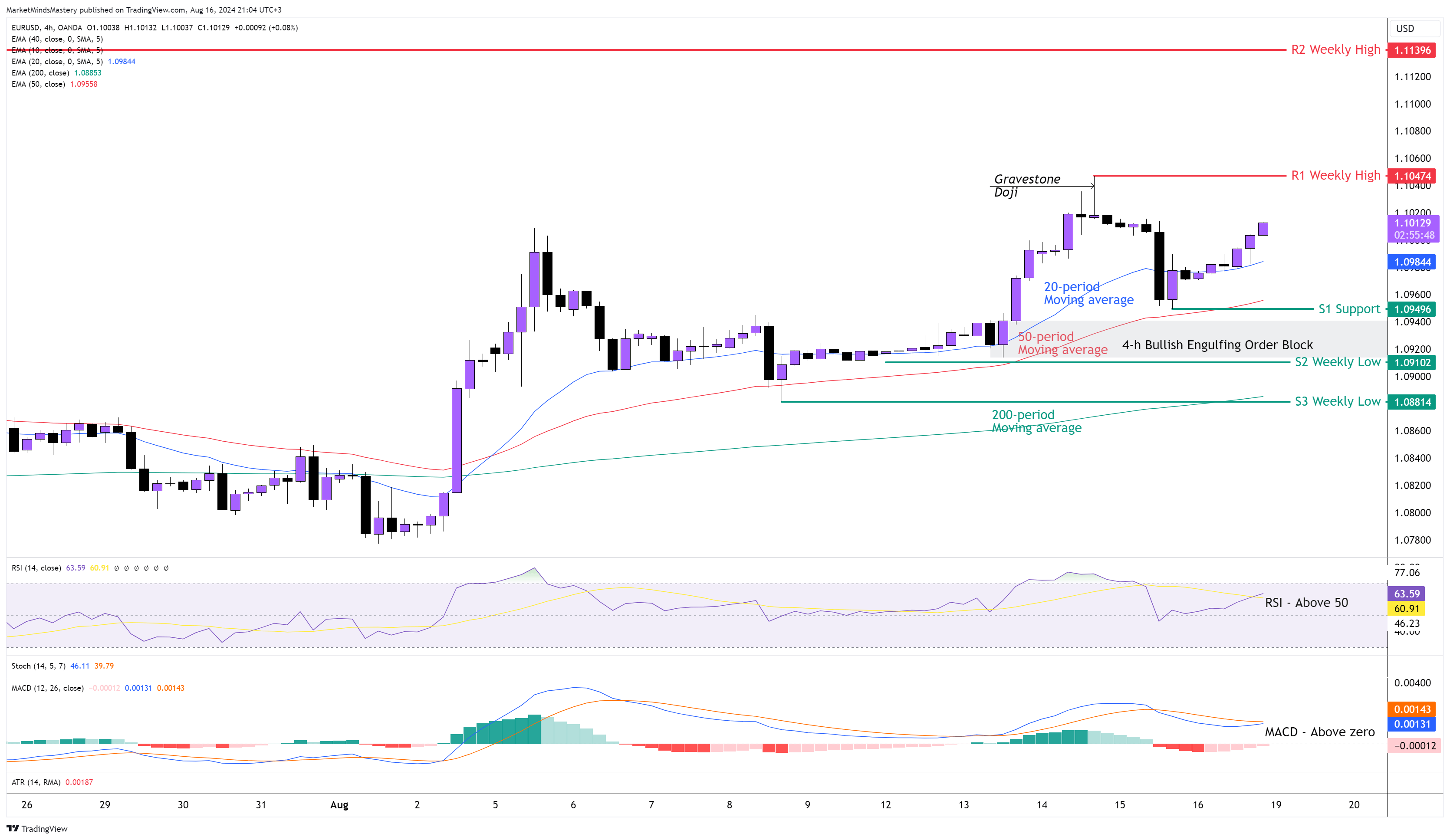 لم تتسبب شمعة الدوجي الموضحة في الرسم البياني الأسبوعي من توقعات السوق الأسبوع الماضي، في محتوى الاتجاه الصعودي الأساسي، في تحرك السعر للأسفل. وعلى العكس من ذلك، اتبع السعر اتجاه السوق الأساسي وتحرك لأعلى. باتباع الاتجاه الصعودي على الرسم البياني لمدة 4 ساعات، استمر السعر في الارتفاع، وفي يوم الأربعاء الماضي، خلق السعر قمة جديدة أعلى من مستوى المقاومة المهم عند مستوى المقاومة 1.10000. ويقع المتوسط المتحرك لـ20 فترة فوق مستوى المقاومة المهم 50 فترة. ويقع المتوسط المتحرك لـ 50 فترة فوق المتوسط المتحرك لـ 200 فترة وهو صعودي. يقع مؤشر مذبذب مؤشر القوة النسبية RSI Oscillator فوق خط الوسط 50. يقع مؤشر MACD فوق خط الصفر، وهو مؤشر صعودي.