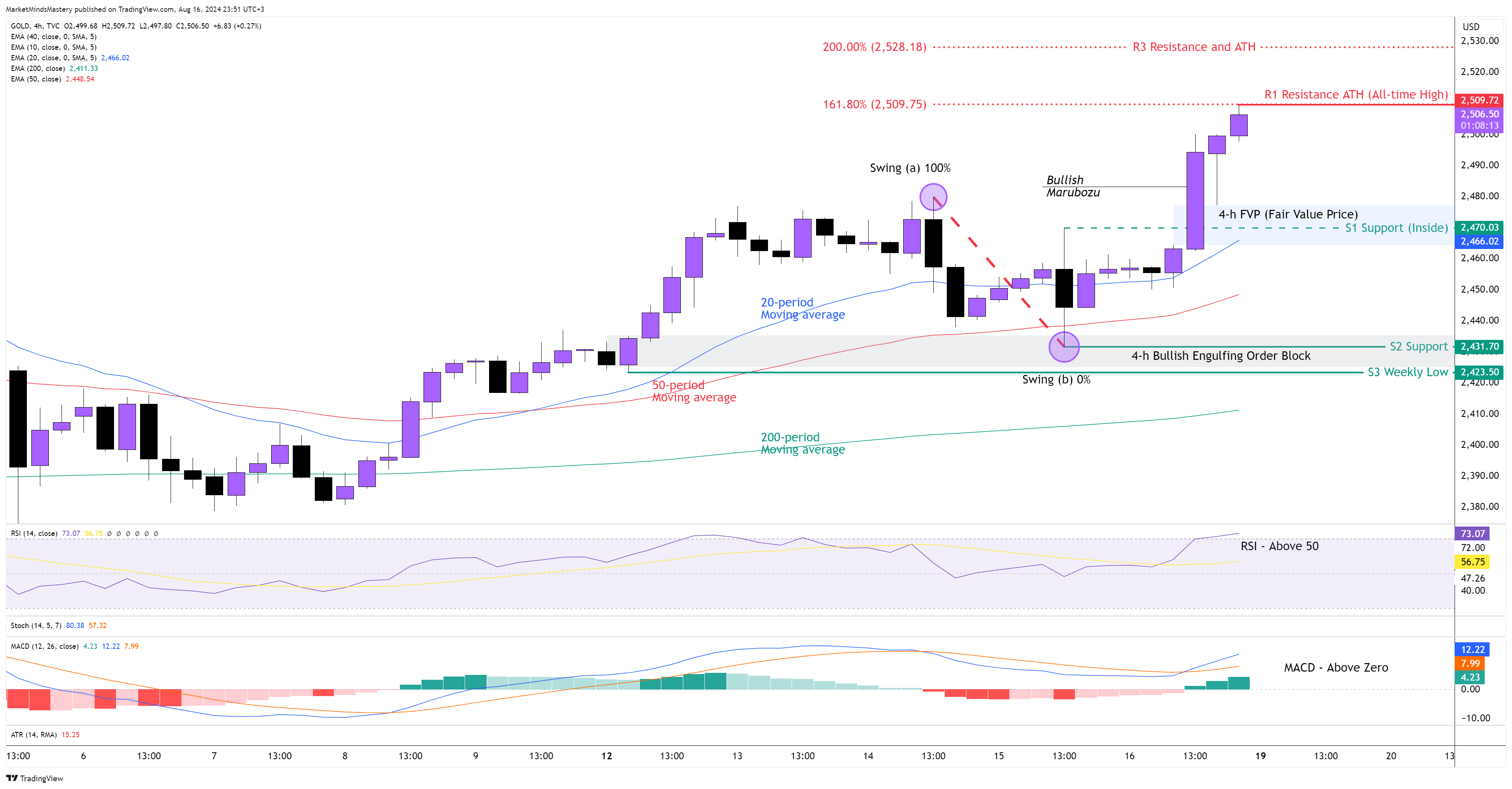 اعتبارًا من يوم الاثنين، إذا استمر السعر في التحرك صعودًا، ستكون منطقة المقاومة الأولى، R1، هي أعلى مستوى في الأسبوع السابق و ATH حول 2509 دولار. يتعايش هذا المستوى بالضبط مع مستوى 161.8% من امتداد فيبوناتشي وهو المستوى الذي كان من المفترض أن يكون أول هدف للسعر بعد الاختراق الصعودي. إذا استمر السعر في الارتفاع وتحرك عبر مستوى R1، فإن منطقة المقاومة التالية، R2، ستكون حول مستوى 2528 دولارًا. هذه هي منطقة امتداد فيبوناتشي 200%، كما هو موضح في الرسم البياني أعلاه.