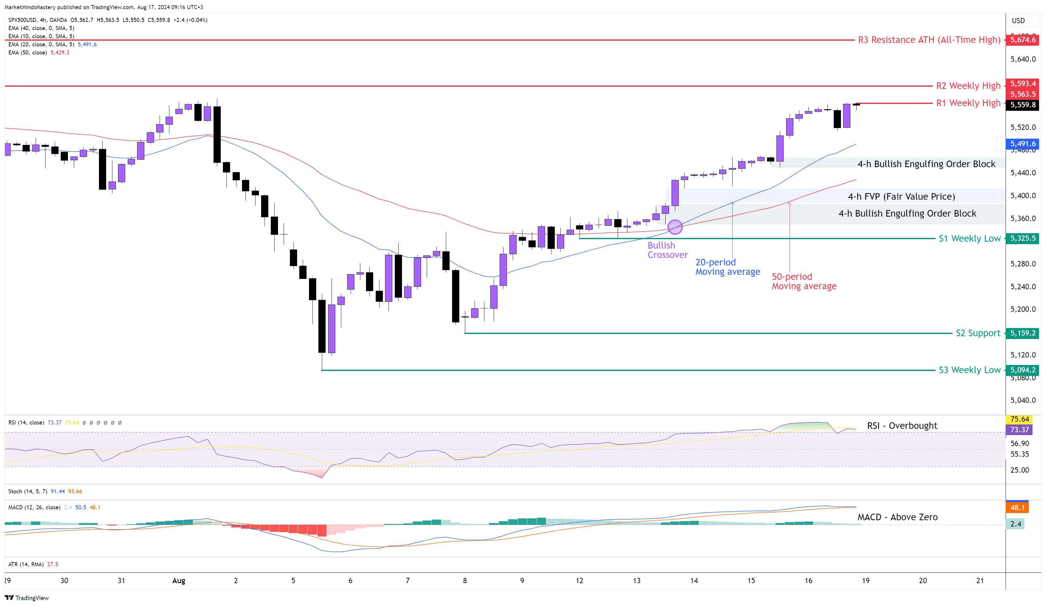 بعد توقعات السوق للأسبوع السابق، تحرك سعر مؤشر SP500 صعودًا كما كان متوقعًا. تسببت الشمعة الأسبوعية على الرسم البياني الأسبوعي، مع وجود الفتيل السفلي الطويل، في تحرك السعر لأعلى، مما أدى إلى إنشاء ماروبوزو صعودي. على الرسم البياني لأربع ساعات، استنادًا إلى تحليل التأرجح، أنشأ السوق هيكل سوق من ارتفاعات أعلى وقيعان أعلى. عندما يتفق الإطاران الزمنيان على الاتجاه، فعادةً ما تقدم الأسواق فرص تداول عالية الاحتمالية. يوم الثلاثاء الماضي، تقاطع مؤشر يوم الثلاثاء الماضي فوق المتوسط المتحرك لفترة 20 فوق المتوسط المتحرك لفترة 50، والمعروف باسم مؤشر القوة النسبية في حالة إفراط في الشراء حيث تحرك فوق خط الحد العلوي 70. وتحرك مؤشر MACD فوق خط الصفر، وله آثار صعودية. بالإضافة إلى ذلك، يقع الرسم البياني للماكد فوق خط الصفر. يوم الثلاثاء الماضي، تشكلت كتلة أوامر الابتلاع الصعودية يوم الثلاثاء الماضي حول 5350 دولارًا أمريكيًا، ويوم الخميس الماضي، تشكلت كتلة أوامر الابتلاع الصعودية يوم الخميس الماضي حول 5460 دولارًا أمريكيًا;
