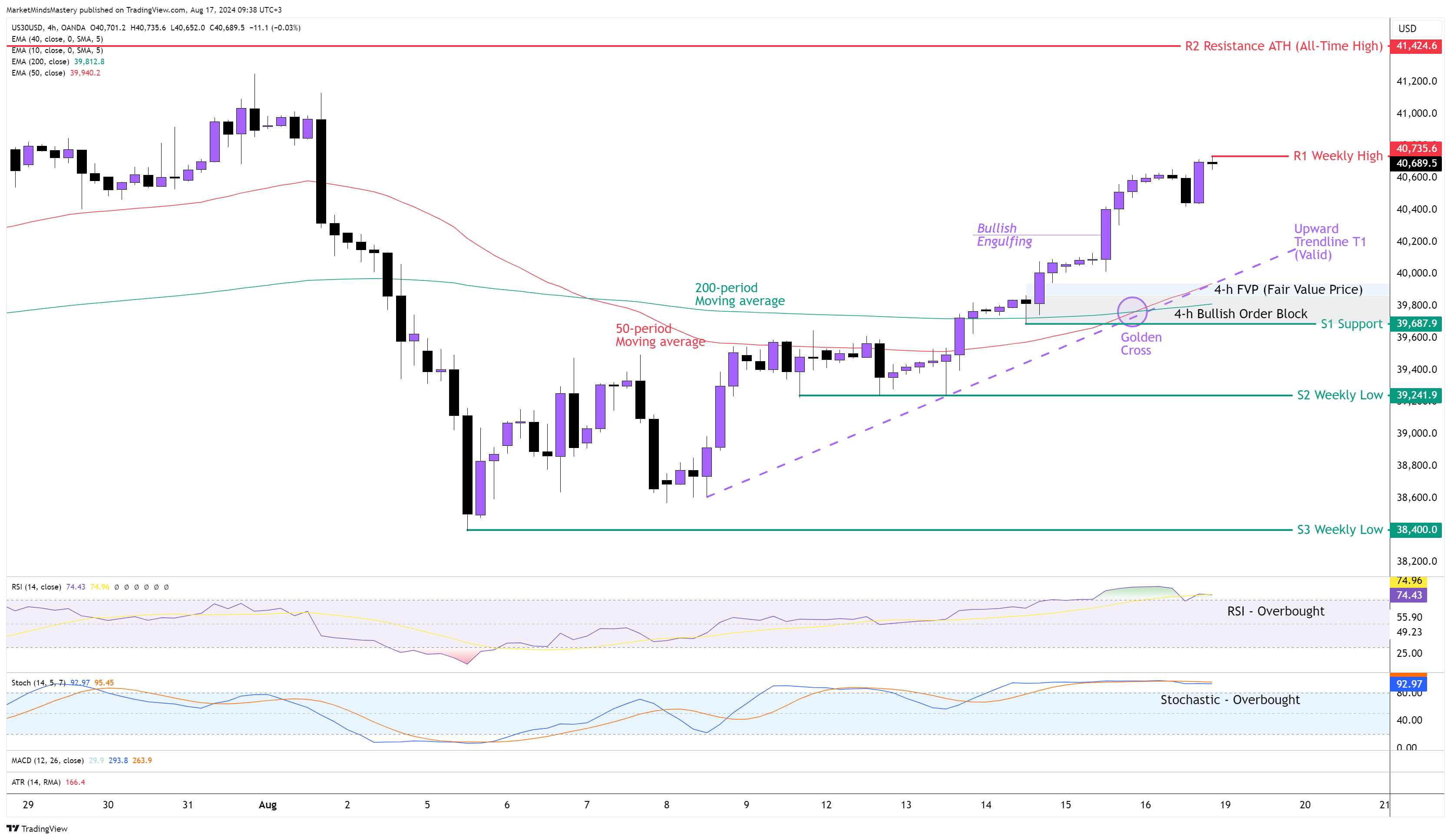 كان مؤشر US30 الأمريكي من بين المؤشرات ذات الأداء الجيد خلال الأسبوع الماضي، ووفر فرص تداول للمتداولين اليوميين. وبقيادة هيكل السوق الأسبوعي وحركة السعر الانعكاسية الصعودية ، كان السوق يتحرك في المقام الأول من خلال تراكم أوامر الشراء . أغلقالسعر الأسبوعي على الرسم البياني الصعودي، وهذا يدل على قوة السوق الصاعدة. على الرسم البياني لأربع ساعات، أنشأ السعر سلسلة من الارتفاعات المرتفعة والقيعان المرتفعة. استنادًا إلى تحليل التأرجح ، تكشف الارتدادات الضحلة عن قوة السوق. في يوم الجمعة الماضي، عبر مؤشر فوق المتوسط المتحرك لـ 200 فترة ، والذي يسمى "التقاطع الذهبي". تحرك مؤشر فوق 70، وأصبح مؤشر Overbought. كما أن مؤشر ستوكاستيك مؤشر ستوكاستيك في حالة أوفر شراء، مما يشير إلى الاتجاه الصعودي. نظرًا لعدم وجود تأرجح مؤكد على الرسم البياني للسعر، لا يمكننا استخدام أداة تصحيح فيبوناتشي للتنبؤ بالنسبة المئوية للارتدادات. ولذلك، بدءًا من يوم الإثنين، إذا استمر السعر في التحرك صعودًا، ستكون منطقة المقاومة الأولى، R1، هي قمة الأسبوع السابق، حوالي 40735 دولارًا. إذا اخترق السعر R1 واستمر في الصعود، ستكون منطقة المقاومة التالية، R2، هي منطقة المقاومة التالية R2 (أعلى مستوى على الإطلاق) عند 41424 دولارًا.