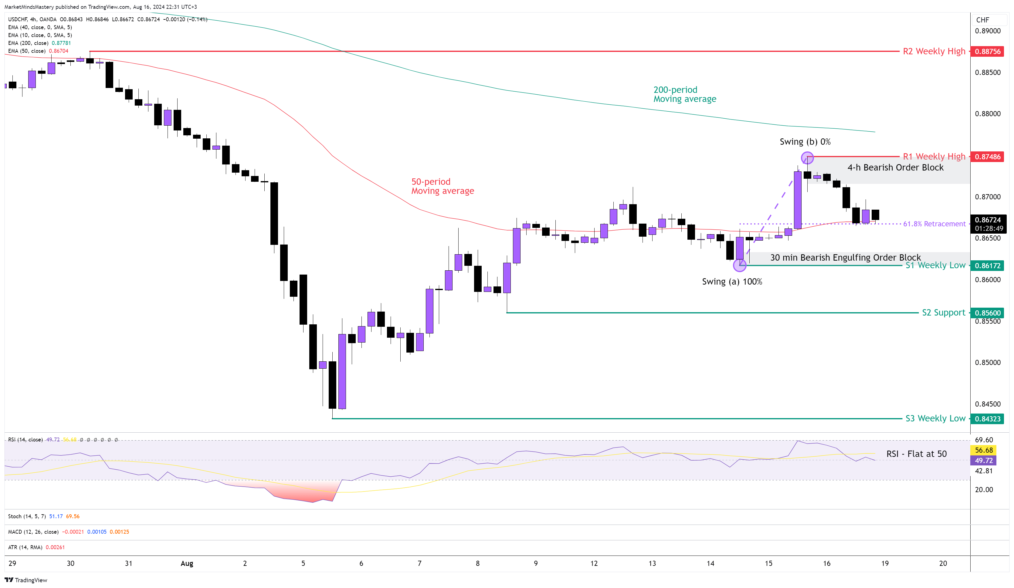 يوم الأربعاء الماضي، على الرسم البياني للأربع ساعات، انتهى السعر عند (سعر القيمة العادلة) الذي حددناه على الرسم البياني. ثم ارتد السعر بعد ذلك، وأنشأ تشكيل قمة أعلى وقاع أعلى. ولذلك، هناك تعارض بين اتجاهات الرسم البياني الأسبوعي والرسم البياني الذي مدته 4 ساعات. يحدث هذا في كثير من الأحيان وهو أمر لا مفر منه، حيث أن الإطار الزمني الأدنى دائمًا ما يكون جزءًا من التصحيح الذي يحدث في الإطار الزمني الأعلى. يقع المتوسط المتحرك لـ تحت المتوسط المتحرك لـ ، وهذا له آثار هبوطية. يقع مؤشر القوة النسبية RSI Oscillator حول خط الوسط عند 50، ويظهر سلوكًا سعريًا غير حاسم أكثر من كونه في اتجاه قوي. يوم الأربعاء الماضي، تشكلت كتلة أوامر الابتلاع الصعودية على الرسم البياني لمدة 30 دقيقة حول 0.86250 وكتلة أوامر الابتلاع الهبوطية على الرسم البياني لمدة 4 ساعات حول 0.87300. حاليًا، يقع السعر حاليًا فوق المتوسط المتحرك لفترة 50 يومًا وعند مستوى تصحيح فيبوناتشي 61.8% والمعروف باسم "النسبة الذهبية". وابتداءً من يوم الاثنين، إذا تحرك السعر لأسفل، ستكون منطقة الدعم الأولى، S1، هي أدنى مستوى في الأسبوع السابق، حول 0.86172. إذا تم رفض السعر عند هذا المستوى وتحرك لأسفل، فسوف يكسر أولاً الاتجاه الصعودي الحالي، وسيضع الرسم البياني للأربع ساعات في اتجاه هبوطي، مثل الرسم البياني الأسبوعي. وفي هذه الحالة، ستكون منطقة الدعم التالية، S2، هي منطقة الدعم 0.85600. وأي حركة هبوطية أخرى ستجد دعم S3 حول 0.84323. وعلى العكس من ذلك، إذا استمر السعر في الاتجاه الصاعد لمدة 4 ساعات، ستكون منطقة المقاومة الأولى، R1، هي قمة الأسبوع السابق عند 0.87486. إذا اخترق السعر R1 واستمر في الارتفاع، فإن منطقة الدعم التالية، R2، ستكون 0.88756، وهي قمة أسبوعية أخرى.