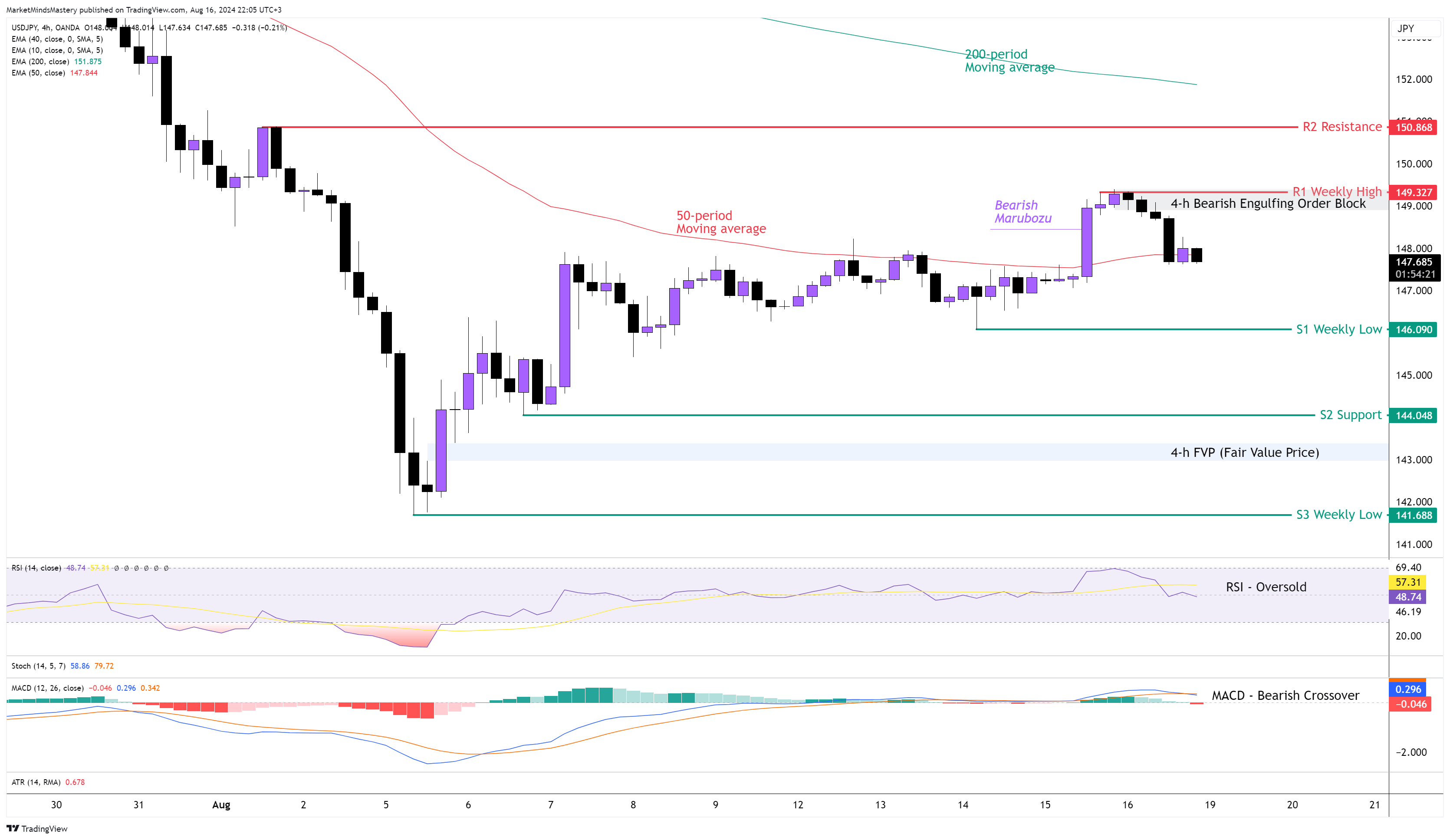 بعد شريط الدبوس الصاعد (الذي يشبه شمعة التنين الطائر) على الرسم البياني الأسبوعي، كان من المتوقع أن يتحرك السعر صعودًا في ظل حجم كبير من الأحجام، ولكن ذلك لم يحدث. وبدلاً من ذلك، تقدم السعر بمقدار 100 نقطة تقريبًا فقط. وهذا يدل على ضعف السوق الذي يدفع السعر للأعلى، وربما لا تكون أوامر الشراء كافية لدعم ارتفاع الأسعار. على الرسم البياني لمدة 4 ساعات، فإن مؤشر أدنى من مؤشر ، وهذا أمر هبوطي. ويقع مؤشر RSI حول خط الوسط 50. قام مؤشر MACD بإنشاء تقاطع هبوطي بينما هو فوق خط الصفر، وهذا عادة ما يكون له آثار هبوطية. تحرك المدرج التكراري للماكد أسفل خط الصفر، وهذا يدل على أن الأسعار بدأت في الانخفاض. من يوم الاثنين فصاعدًا، إذا انخفض السعر أكثر من ذلك، فإن منطقة الدعم الأولى، S1، ستكون منطقة الدعم الأولى S1 هي أدنى مستوى للأسبوع السابق، حول 146.090. وإذا اخترق السعر منطقة الدعم الأولى (S1) واجتازها، ستكون منطقة الدعم التالية، S2، حول 144 ومنطقة الدعم الثانية (S3) حول 141.688، وهي قاع أسبوعي قديم. حول 143.000، توجد منطقة دعم حول 143.000، وهي منطقة FVP (سعر القيمة العادلة). على العكس من ذلك، إذا ارتد السعر وتحرك لأعلى، ستكون منطقة المقاومة الأولى، R1، هي قمة الأسبوع السابق، حول 149.327. حول هذا المستوى، الأسبوع الماضي، شكل السوق الأسبوع الماضي كتلة أمر الابتلاع الهبوطي ، والتي يمكن أن توفر مقاومة إضافية في السعر. إذا اخترق السعر R1 واستمر في الارتفاع، فإن منطقة المقاومة التالية R2 ستكون 150.868. . ؛