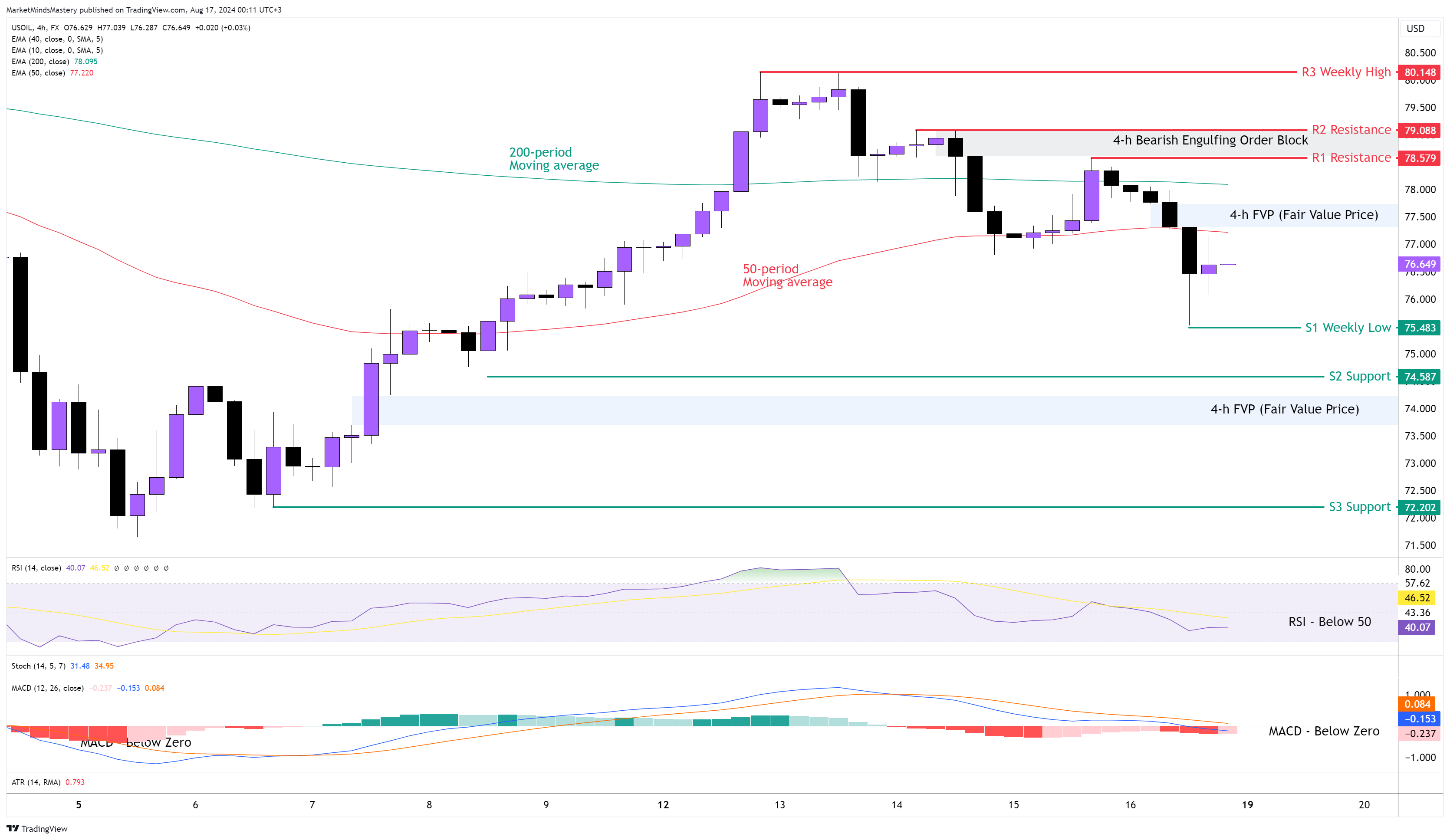 على الرغم من أن الرسم البياني الأسبوعي لا يحتوي على اتجاه واضح المعالم، و الفترة 10 تحت المتوسطات المتحركة الأسبوعية 40 فترة أسبوعية (لا نظهر في الرسم البياني أعلاه)، إلا أنه يعتبر مؤشرًا هبوطيًا. انتهى السعر على الرسم البياني الأسبوعي على شكل انعكاس هبوطي مع وجود ويك علوي طويل وجسم حقيقي صغير. على الرسم البياني للأربع ساعات، يخلق السعر سلسلة من القمم المنخفضة والقيعان المنخفضة، ويعتبر مؤشر هبوطي. المتوسط المتحرك لـ أدنى من المتوسط المتحرك لـ ، وهو مؤشر هبوطي. ومن المؤشرات الهبوطية الأخرى وجود مؤشر القوة النسبية تحت خط الوسط 50، ووجود مؤشر MACD تحت خط الصفر. وبالإضافة إلى ذلك، كان الماكد الرسم البياني للماكد تحت خط الصفر منذ يوم الأربعاء الماضي. في الأسبوع الماضي، أنشأ السعر الأسبوع الماضي كتلة أوامر الابتلاع الهبوطية عند حوالي 79 دولارًا و سعر القيمة العادلة عند حوالي 77.50 دولارًا. كانت أسعار إغلاق الشموع القليلة الماضية أقل من المتوسط المتحرك لـ 50 فترة. ولذلك، إذا استمر السعر في الانخفاض، فإن منطقة الدعم الأولى ستكون حول 75.48 دولارًا، وهو أدنى سعر للأسبوع السابق. إذا اخترق السعر ما دون S1 واستمر في الهبوط، فإن منطقة الدعم التالية، S2، ستكون 74.58 دولار. وفي حال اخترق السعر S2 وواصل التحرك للأسفل، ستكون منطقة الدعم التالية، S3، حول 72.20 دولار. وعلى العكس من ذلك، إذا ارتد السعر وتحرك لأعلى، فإن منطقة المقاومة الأولى، R1، ستكون حول 78.57 دولار. سيجد اختراق مستوى R1 منطقة المقاومة التالية، R2، حول 79.088 دولارًا ومنطقة المقاومة التالية، R3، عند 80.148 دولارًا، وهي أعلى مستوى في الأسبوع السابق.