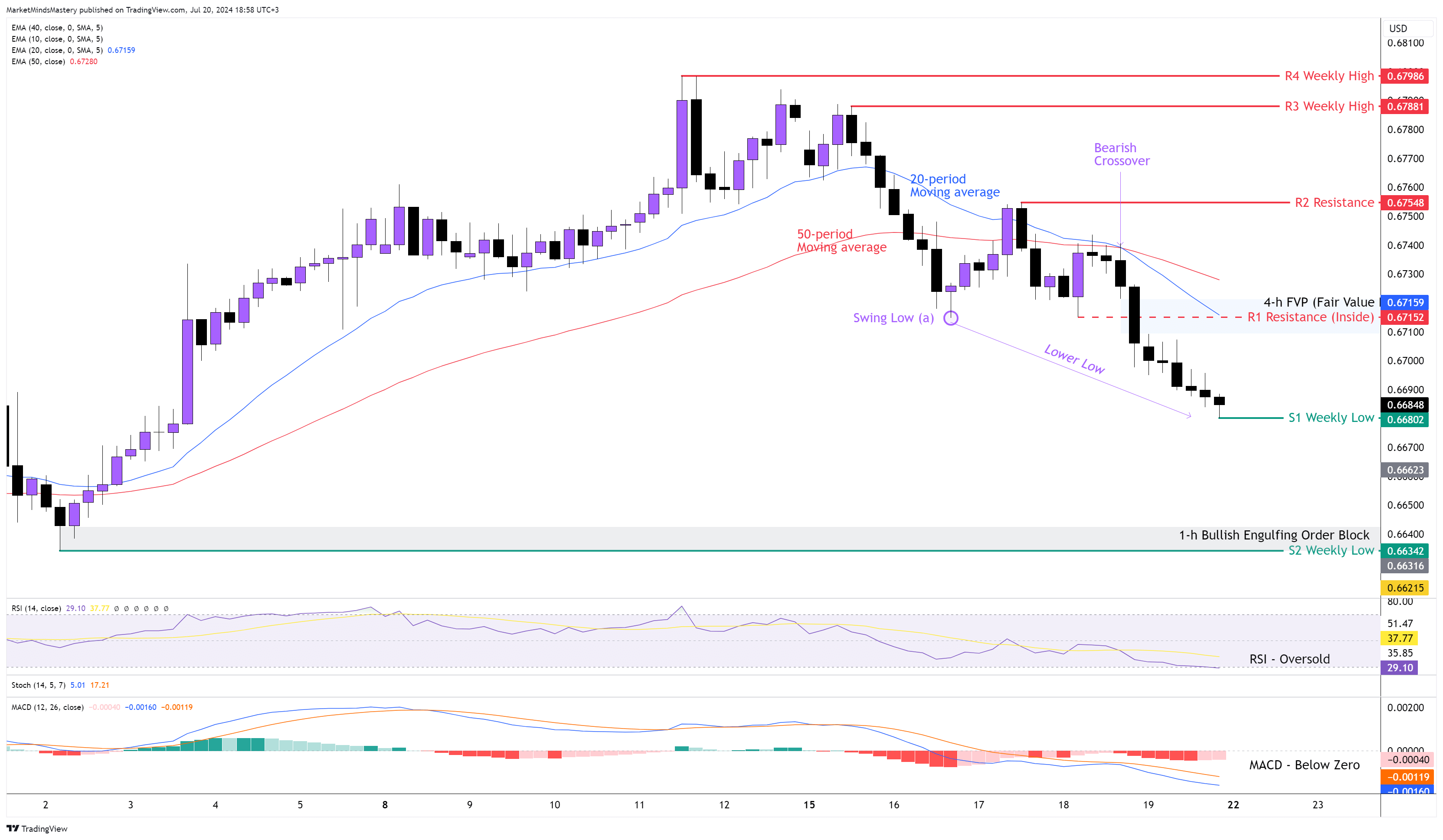 كانت الزيادة في معدل البطالة في أستراليا يوم الخميس الماضي حافزًا لإضعاف الدولار الأسترالي. اخترق السعر منذ ذلك الحين أدنى قاع التأرجح السابق عند (أ)، مما أدى إلى تكوين شمعة هابطة طويلة على الرسم البياني الأسبوعي و قاع منخفض وأيضًا قمة منخفضة على الرسم البياني للأربع ساعات. من المهم أن نذكر أن الاتجاه الأساسي الاتجاه الأساسي (الاتجاه الأسبوعي) صاعد. مؤشر القوة النسبية في حالة ذروة البيع، كما هو موضح على الرسم البياني أعلاه، ومؤشر الماكد تحت الصفر، مع وجود مخطط هيستوجرامي يظهر أشرطة هابطة. كلا المؤشرين لهما آثار هبوطية على زوج العملات AUDUSD. أنشأ كل من المتوسطين المتحركين لفترة 20 فترة والمتوسط المتحرك لفترة 50 فترة تقاطع هبوطي وهذا أيضًا هبوطي. من يوم الاثنين فصاعدًا، إذا استمر السعر في التحرك لأسفل لمواصلة الاتجاه الهبوطي لمدة 4 ساعات، فإن منطقة الدعم الأولى، S1، ستكون أدنى مستوى للأسبوع السابق، حول 0.66802. إذا اخترق السعر S1 واستمر في الهبوط، فإن منطقة الدعم التالية، S2، ستكون قاع أسبوعي آخر، حوالي 0.66342. وعند هذا المستوى، تم تشكيل كتلة أوامر الابتلاع الصعودية عند هذا المستوى في بداية شهر يوليو، ولم يتم اختبارها بعد.