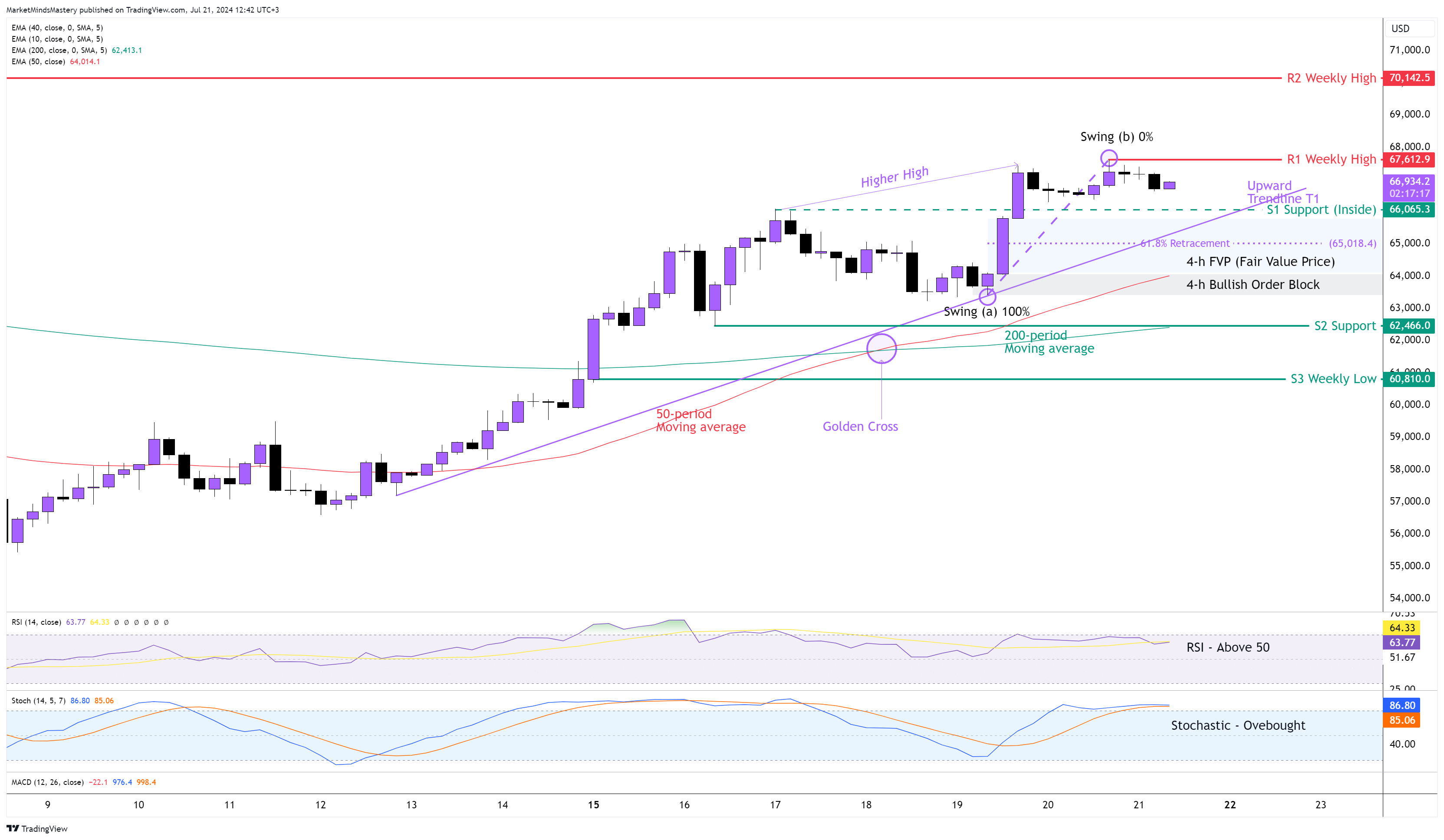مؤشر القوة النسبية RSI مؤشر التذبذب فوق مستوى 50، وهو مؤشر صعودي. أما مؤشر ستوكاستيك فهو في حالة "ذروة الشراء"، وهو أيضًا مؤشر صعودي. ابتداءً من يوم الاثنين، إذا واصل السعر حركته الصاعدة، فإن منطقة المقاومة الأولى، R1، ستكون أعلى مستوى في الأسبوع السابق، حوالي 67612 دولارًا أمريكيًا. في حالة اختراق السعر لمنطقة R1 واستمراره في الصعود، ستكون منطقة المقاومة التالية، R2، 70142 دولارًا.