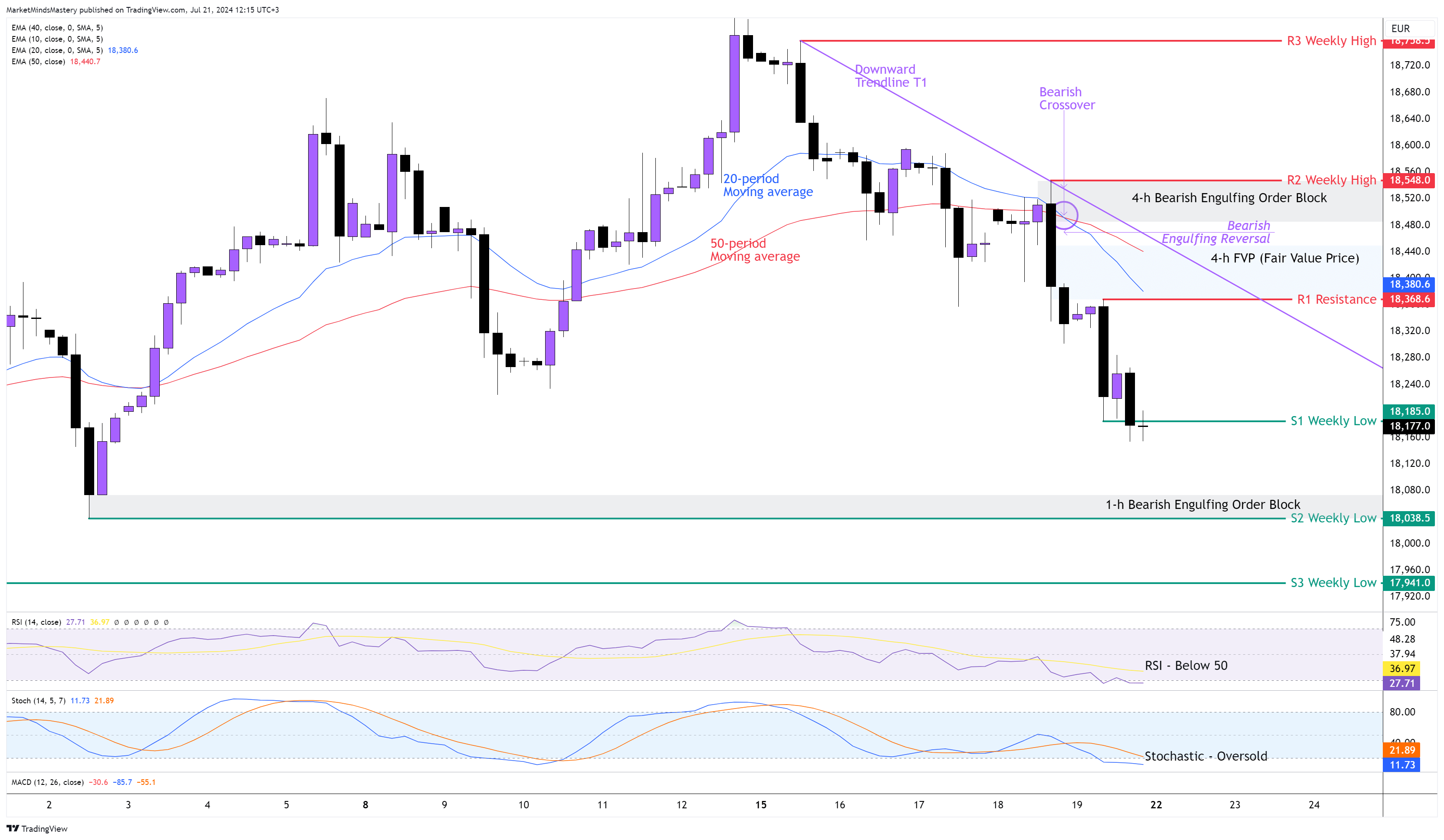 مؤشر RSIالمؤشر المذبذب أقل من 50، مما يشير إلى هبوط في GER30. أيضًا، مؤشر ستوكاستيك المذبذب حاليًا في حالة البيع المفرط، وهو مؤشر هبوطي آخر. حاليًا، لا يوجد تآكل صعودي على مؤشر ستوكاستيك. يتداول السوق تحت خط الاتجاه الصاعد، T1/strong، وإذا استمر ذلك من يوم الاثنين فصاعدًا، فإن منطقة الدعم الأولى، S1، ستكون أدنى مستوى للأسبوع السابق، حوالي 18185. إذا اخترق السعر S1 وتحرك إلى الأسفل، فإن منطقتي الدعم التاليتين، S2 و S3، ستكونان 18038 و 17941 على التوالي.