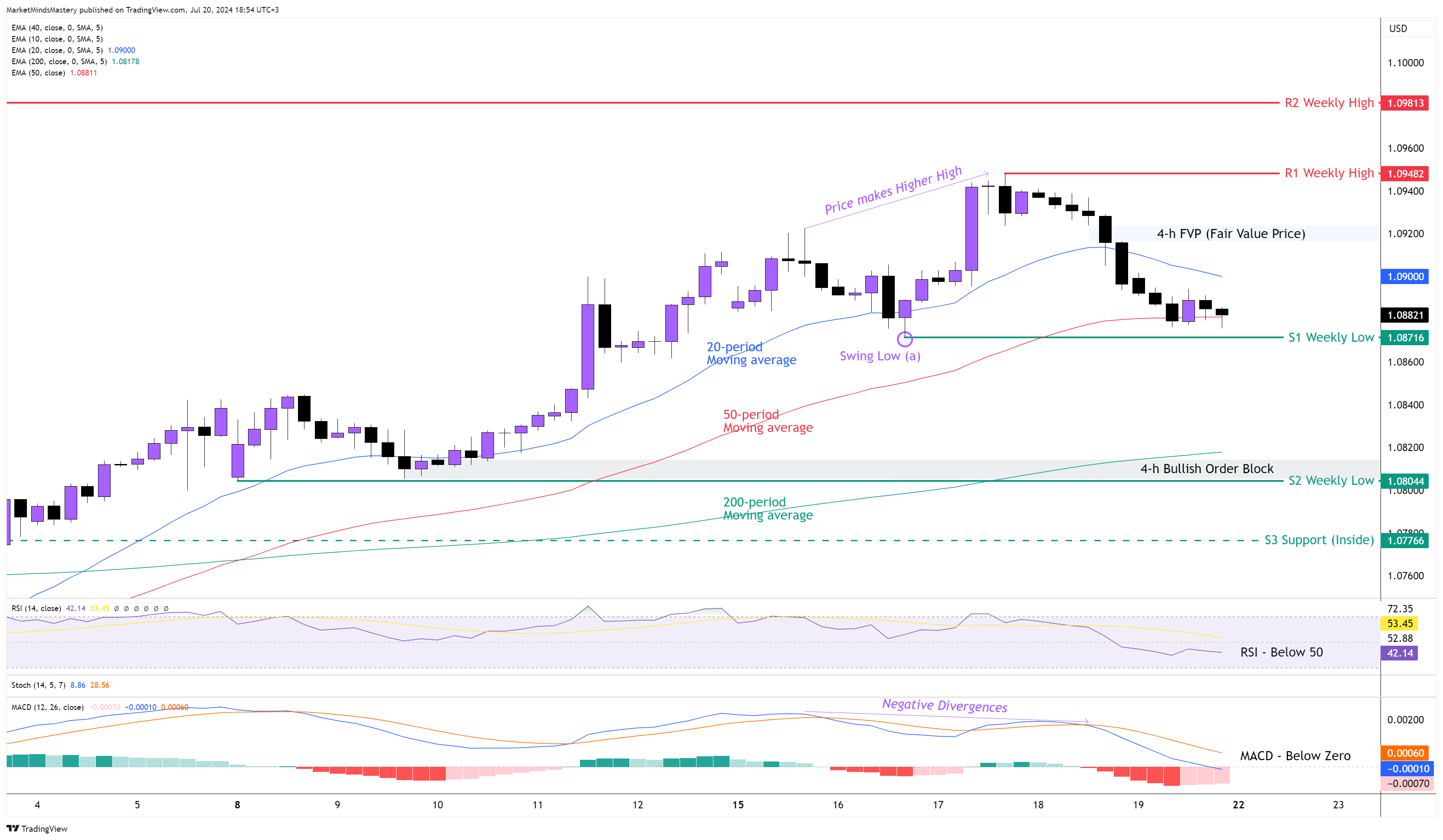 من ناحية أخرى، إذا تحرك السعر لأعلى، ستكون منطقة المقاومة الأولى، R1، هي أعلى مستوى في الأسبوع السابق، حوالي 1.09482.