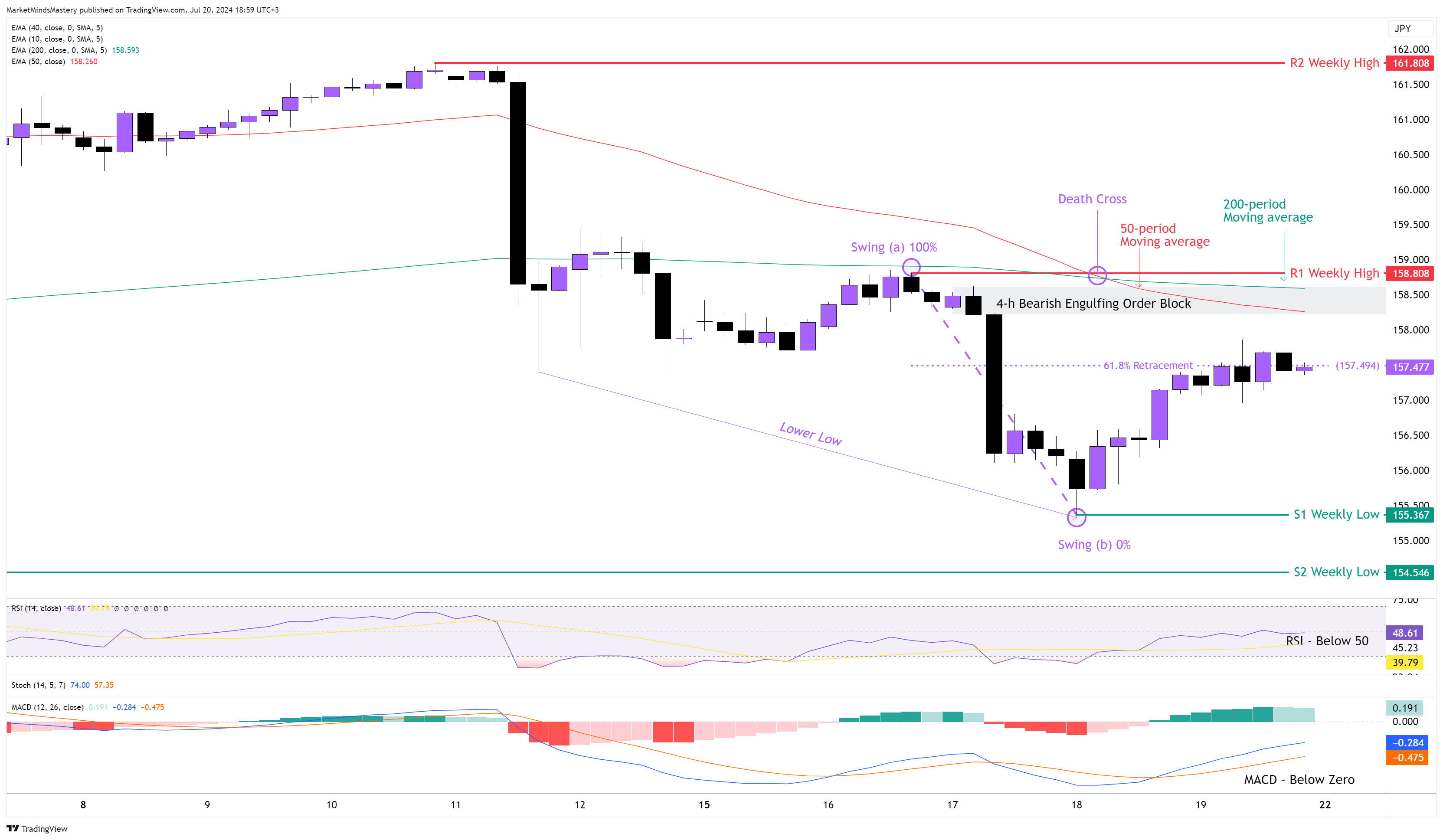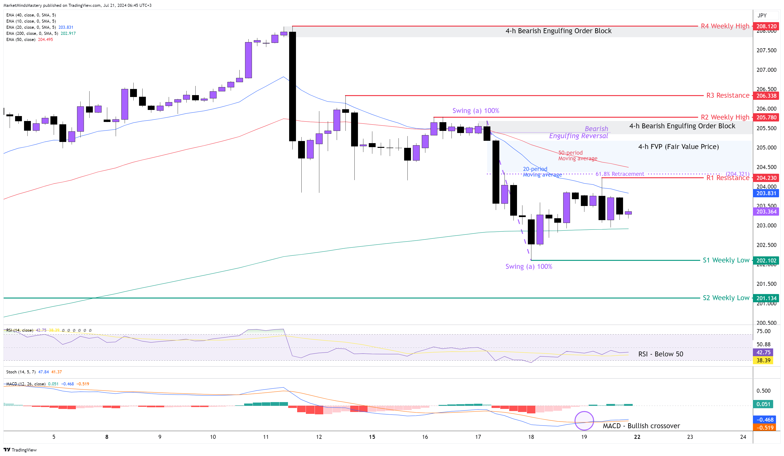 وبالإضافة إلى ذلك، فإن مؤشر MACD يقع تحت خط الصفر وهذا أيضًا هبوطي. حاليًا، يتواجد السعر حاليًا حول النسبة الذهبية من 61.8% فيبوناتشي. إذا وجد السعر مقاومة في هذه المنطقة وانخفض، يمكن أن يتحرك السعر للأسفل حتى قاع الأسبوع السابق، وهو دعم S1، حول 155.367. إذا اخترق السعر الدعم S1 واستمر في الهبوط، فإن منطقة الدعم التالية ستكون قاعًا أسبوعيًا آخر، حوالي 154.546. ومن ناحية أخرى، إذا استمر السعر في التحرك لأعلى دون أن يجد مقاومة عند مستوى 61.8%، ستكون منطقة المقاومة الأولى، R1، هي قمة الأسبوع السابق، حول 158.808. يعتبر هذا المستوى السعري مهمًا لأنه يتعايش مع المتوسط المتحرك لـ 200 فترة، ويمكن أن يكون بمثابة مقاومة ديناميكية ديناميكية، إلى جانب كتلة الأوامر الهبوطية 4-H التي بدأت حركة السعر الاندفاعية الأخيرة. إذا لم يبقى السعر تحت R1، وإذا اخترقها واستمر في التحرك لأعلى، فسوف ينهي الاتجاه الهبوطي الحالي، وسيستأنف الاتجاه الصعودي الأساسي الأسبوعي. في هذه الحالة، ستكون منطقة المقاومة التالية، R2، قريبة جدًا من منطقة المقاومة R2 (أعلى مستوى على الإطلاق)، حول 161.808،