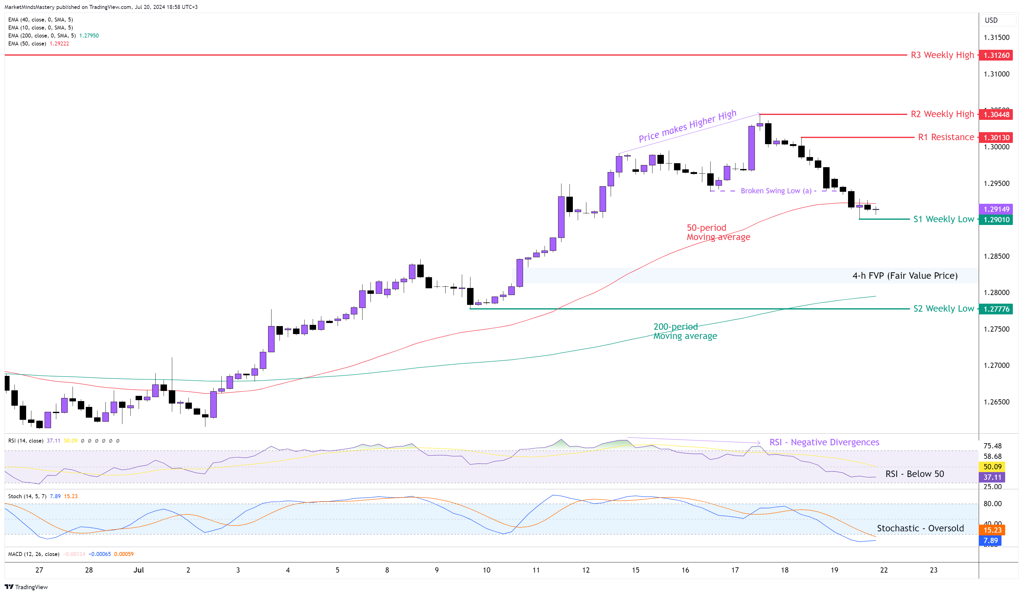 اخترقت قاع التأرجح عند النقطة (أ)، منهية بذلك الاتجاه الصاعد لمدة 4 ساعات. ولكن، لكي يتطور الاتجاه الهابط، يحتاج السعر إلى تحقيق قمة منخفضة، وليس فقط قاع منخفض. ومع ذلك، هذا لا يعني أن السعر لا يمكنه استئناف الاتجاه الصاعد في الإطار الزمني الأعلى. هذه هي المرة الأولى خلال أسبوعين التي يغلق فيها السعر دون المتوسط المتحرك لفترة 50. ومع ذلك، فإن فترة الـ 50 فوق فترة الـ 200، وهذا أمر صعودي. أما مؤشر القوة النسبية RSI فهو أقل من 50، مما يشير إلى أن زخم العملة هابط. مؤشر ستوكاستيك مؤشر ستوكاستيك في حالة البيع المفرط ، وهذا له آثار هبوطية.