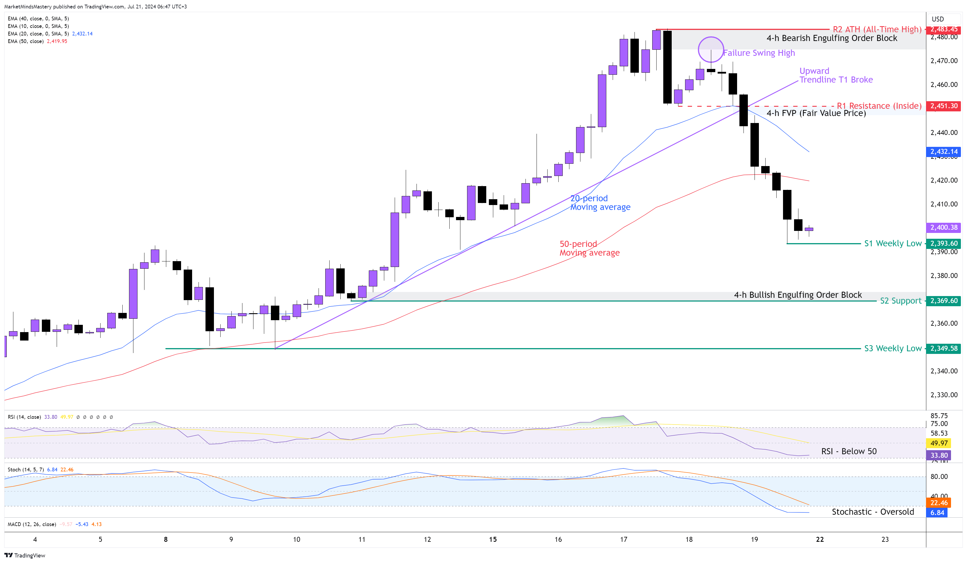 في أعقاب الحركة الصعودية التي شهدها الأسبوع الماضي، سجل سعر الذهب على الرسم البياني الأسبوعي الأسبوعي سعرًا جديدًا (أعلى مستوى له على الإطلاق) يوم الأربعاء الماضي عند 2483 دولارًا أمريكيًا، وبحلول يوم الجمعة الماضي، انخفض السعر حوالي 80 دولارًا أمريكيًا. يُظهر الرسم البياني الأسبوعي شمعدان الشهاب، ويظهر مؤشر ستوكاستيك مذبذب التذبذب السلبي. وهذا مؤشر على أن سعر الذهب قد ينخفض أكثر من ذلك. على الرسم البياني لمدة 4 ساعات، انخفض السعر منذ يوم الخميس الماضي، مع وجود شموع هابطة فقط على الرسم البياني. استنادًا إلى تحليل التأرجح، انكسر خط الاتجاه الصاعد T1 الصاعد، كما هو موضح على الرسم البياني. قمنا بوضع علامة على FVP (سعر القيمة العادلة)، وهو قريب من نقطة كسر خط الاتجاه، ويمكن أن يكون بمثابة عامل مقاومة إضافي. على الرغم من أن السعر يتم تداوله بالفعل تحت المتوسطين المتحركين ، إلا أنهما لم يتقاطعا بعد لمتابعة حركة السعر الهبوطية. المؤشر المتحرك لـ مؤشر القوة النسبية تحت 50، وهذا مؤشر هبوطي، ومؤشر ستوكاستيك في حالة ذروة البيع، وهو أيضًا مؤشر هبوطي. بدءًا من يوم الاثنين، إذا استمر السعر في الانخفاض، ستكون منطقة الدعم الأولى هي أدنى مستوى في الأسبوع السابق، حول 2393 دولارًا. إذا اخترق السعر الدعم الاول S1 وانخفض أكثر، فإن منطقة الدعم التالية، S2، ستكون حول 2369 دولارًا. توجد كتلة أوامر الابتلاع الصعودية عند نفس المستوى. أي حركة هبوطية أخرى ستجد منطقة الدعم التالية، S3، حول 2349 دولارًا. وعلى العكس من ذلك، إذا تحرك السعر لأعلى، فإن المقاومة الأولى، R1، ستكون المقاومة الداخلية حول 2451 دولارًا. إذا اخترق السعر R1 وواصل التحرك لأعلى، فستكون منطقة المقاومة التالية، R2، هي منطقة المقاومة التالية R2 عند 2483 دولارًا.
