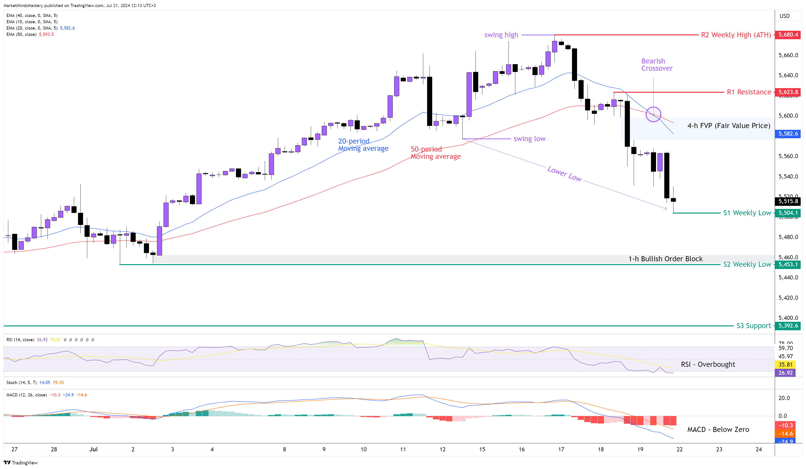 من ناحية أخرى، إذا تحرك السعر لأعلى، ستكون منطقة المقاومة الأولى هي R1، حول 5623 دولارًا. أسفل هذه المنطقة توجد منطقة FVP، والتي تجلب التقاء في السوق لمقاومة إضافية. إذا اخترق السعر R1 وحافظ على حركته الصاعدة، فإن منطقة المقاومة التالية، R2، ستكون منطقة المقاومة R2، حول 5680 دولارًا أمريكيًا.