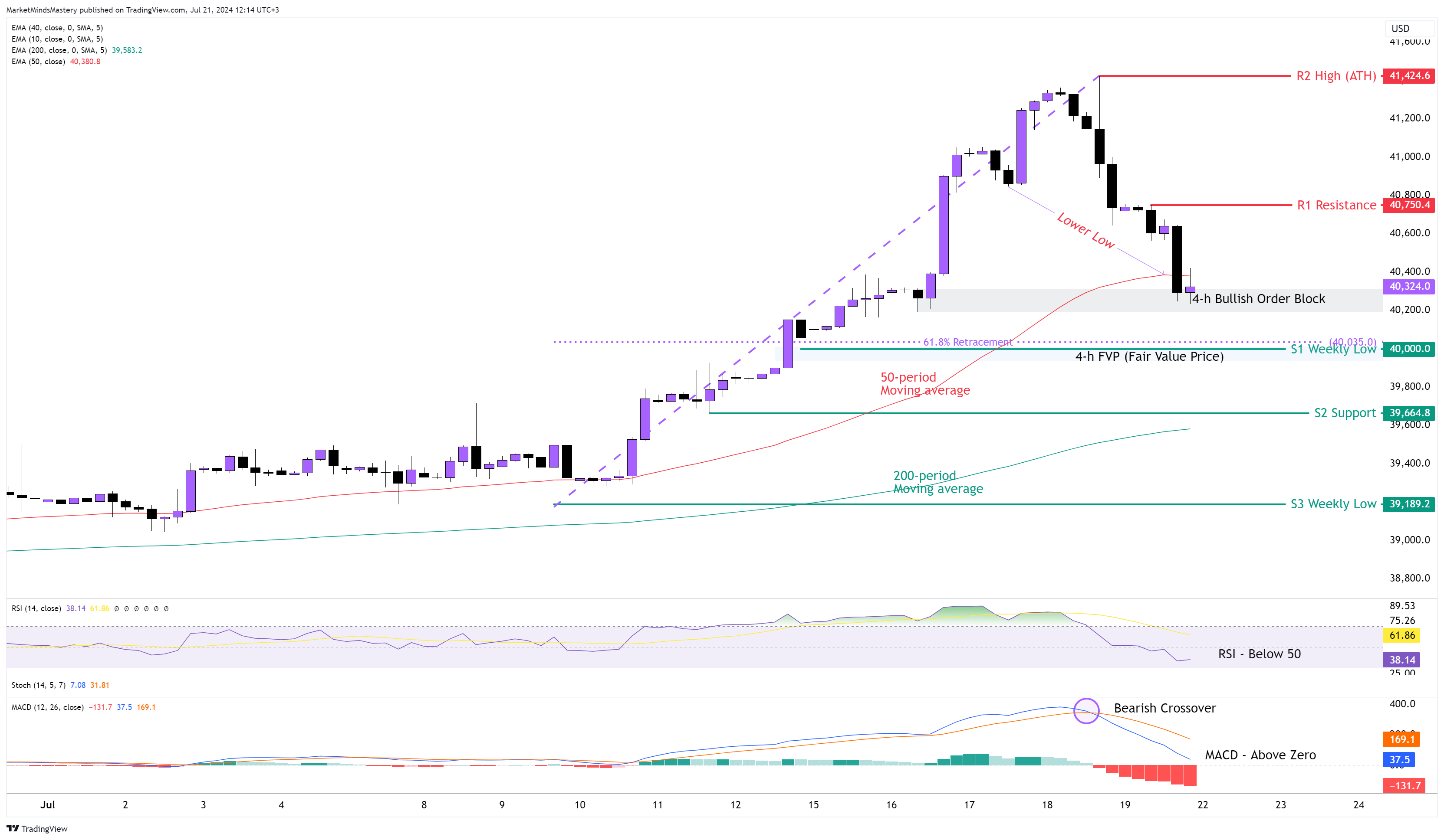 في أعقاب الحركة الصعودية التي شهدها مؤشر US30 الأسبوع الماضي، حقق السعر ارتفاعًا جديدًا (أعلى مستوى له على الإطلاق)، ولكن في نهاية الأسبوع، أنشأ السعر نموذج شمعدان انعكاسي على شكل نجمة شهاب. وهذا يعني أن أوامر البيع تغلبت على أوامر الشراء، وانخفض السعر. يعد هذا النمط من بين أنماط الشموع الأكثر موثوقية في تحليل الشموع اليابانية بمجرد إنشائه بعد اتجاه صعودي واضح المعالم. من المهم أن نذكر أن نموذج MACD على المخطط الأسبوعي لم يتبع حركة السعر الصاعدة، ولم يخلق قمة جديدة. وبدلاً من ذلك، قام بطباعة السالب Diverneces A'class. الرسم البياني للأربع ساعات في المرحلة التصحيحية للرسم البياني الأسبوعي. ومع ذلك، فإن فرصة هيكل السوق وأول تشكيل أول قاع منخفض يشير إلى وجود ضغط هبوطي في السوق. لا يزال مؤشر MACD فوق الصفر ولكن مع وجود تقاطع هبوطي ، كما هو موضح على الرسم البياني. يقع مؤشر مؤشر التذبذب مؤشر القوة النسبية تحت مستوى 50، حيث وصل إلى حالة ذروة البيع. يقع المؤشر 50-فترة أعلى من المتوسط المتحرك 200 فترة، وهذا أمر صعودي. المتوسطات المتحركة هي مؤشرات متأخرة عندما تأتي إلى بداية انعكاس الاتجاه.