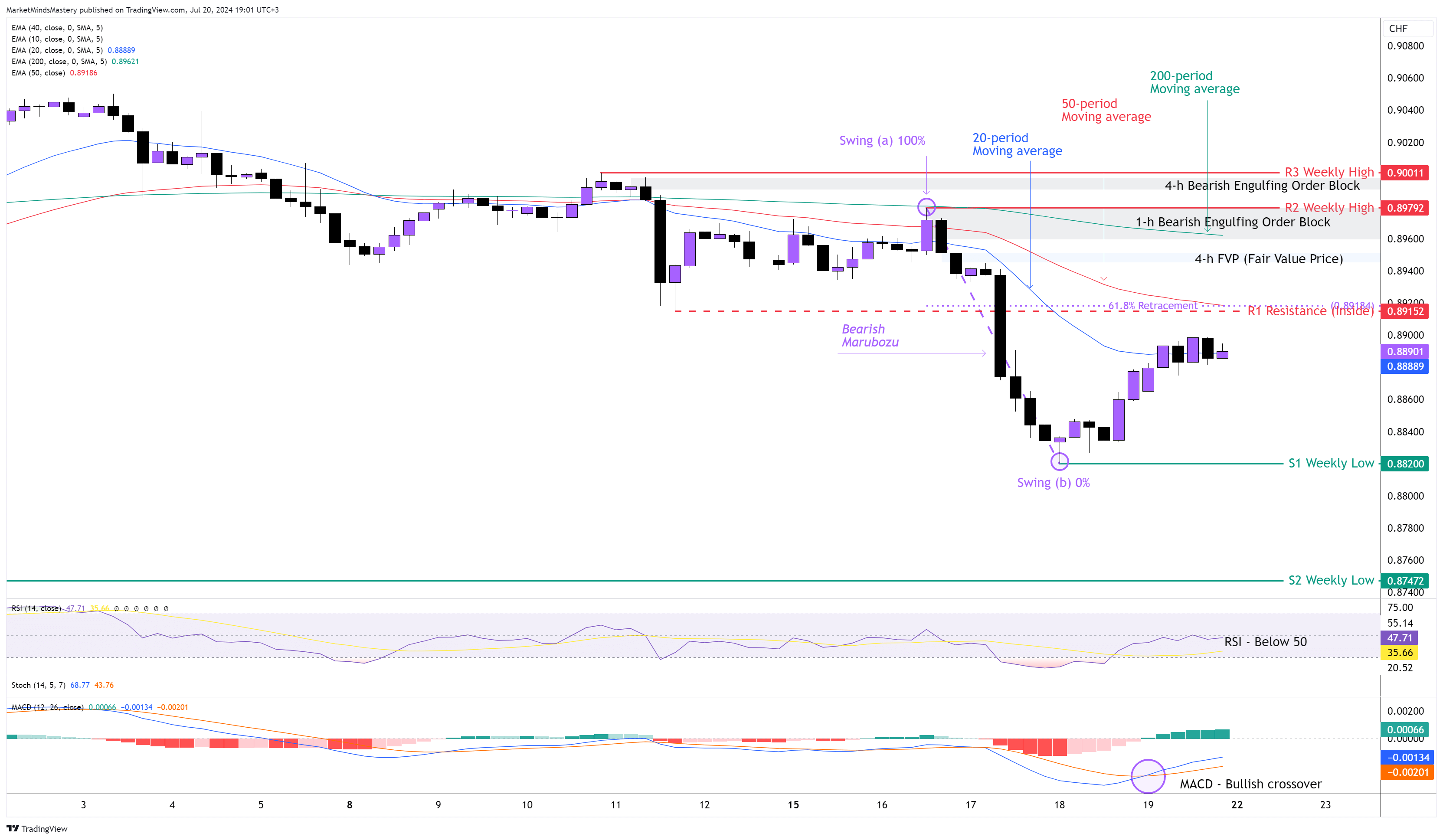 في أعقاب الحركة الهبوطية التي بدأت في بداية شهر يوليو، خلق سعر الدولار الأمريكي مقابل الفرنك السويسري قاعًا منخفضًا جديدًا وقمة منخفضة يوم الأربعاء الماضي بعد أن كسرت شمعة الشمعة الهبوطية ماروبوزو قاع الأسبوع السابق، كما أشرنا على الرسم البياني. انخفض السعر حتى المنطقة التي أشرنا إليها في توقعاتنا للسوق في الأسبوع السابق على أنها كتلة أوامر الابتلاع الهبوطية الهبوطية، ثم ارتد وتحرك صعودًا حتى المتوسط المتحرك لـ20 فترة.