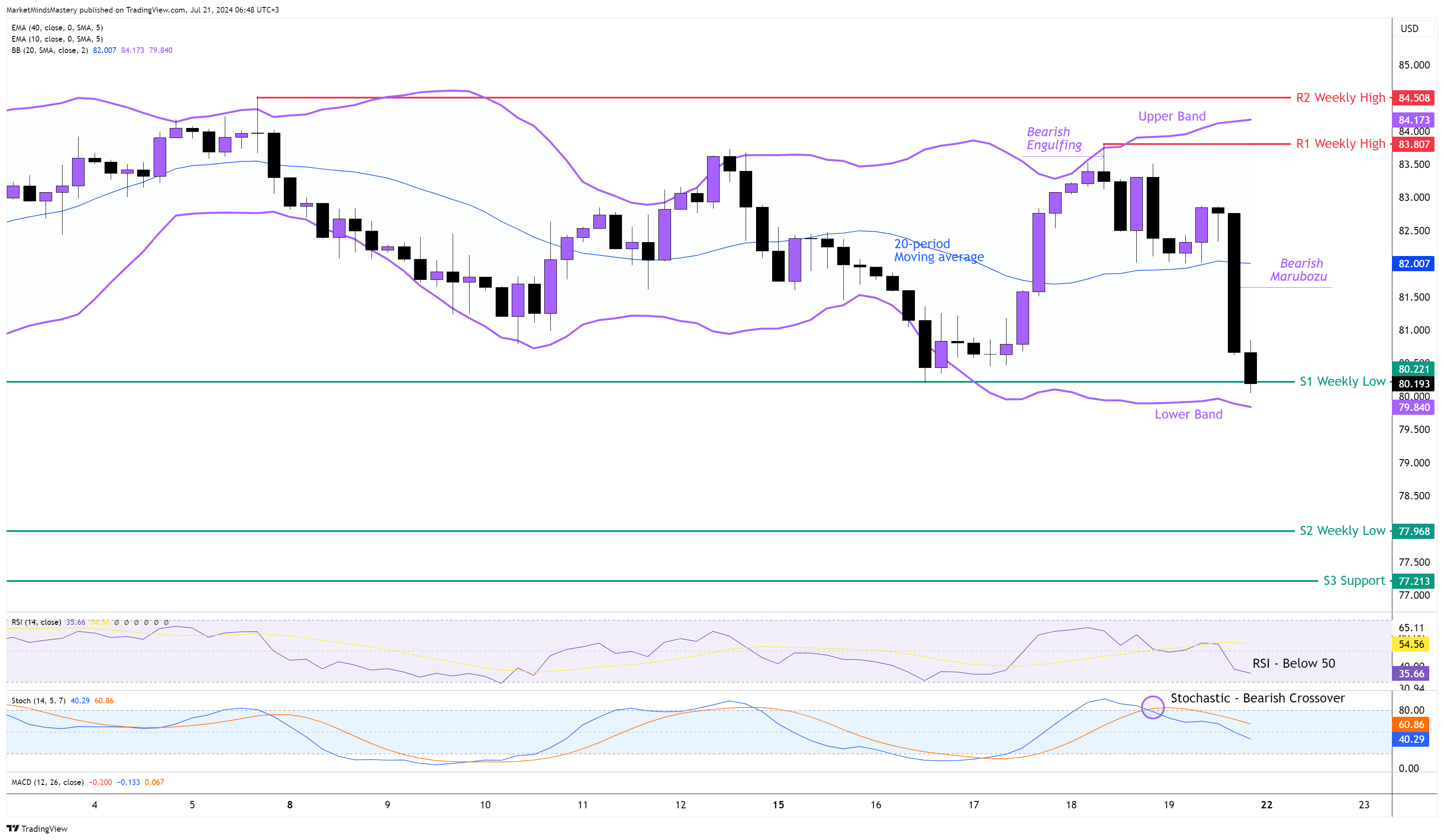 ابتداءً من يوم الاثنين، إذا وجد السعر دعمًا عند النطاق السفلي وارتد وتحرك لأعلى، فإن منطقة المقاومة الأولى، R1، ستكون أعلى مستوى في الأسبوع السابق حول النطاق العلوي العلوي عند 83.80 دولار. إذا اخترق السعر R1 واستمر في الارتفاع، فستكون منطقة المقاومة التالية، R2، على مسافة قريبة، وسيصل إلى قمة أسبوعية أخرى عند 84.50 دولارًا. من ناحية أخرى، إذا اتبع السعر زخم حركة السعر الأسبوعية واستمر في التحرك لأسفل، فإن منطقة الدعم الأولى، S1، ستكون أدنى مستوى في الأسبوع السابق، عند 80.24 دولار تقريبًا، حيث السعر الحالي. إذا اخترق السعر S1 واستمر في الانخفاض، فستكون منطقة الدعم التالية، S2، عندئذٍ ستكون منطقة الدعم التالية، S2 عند 77.96 دولارًا أمريكيًا.