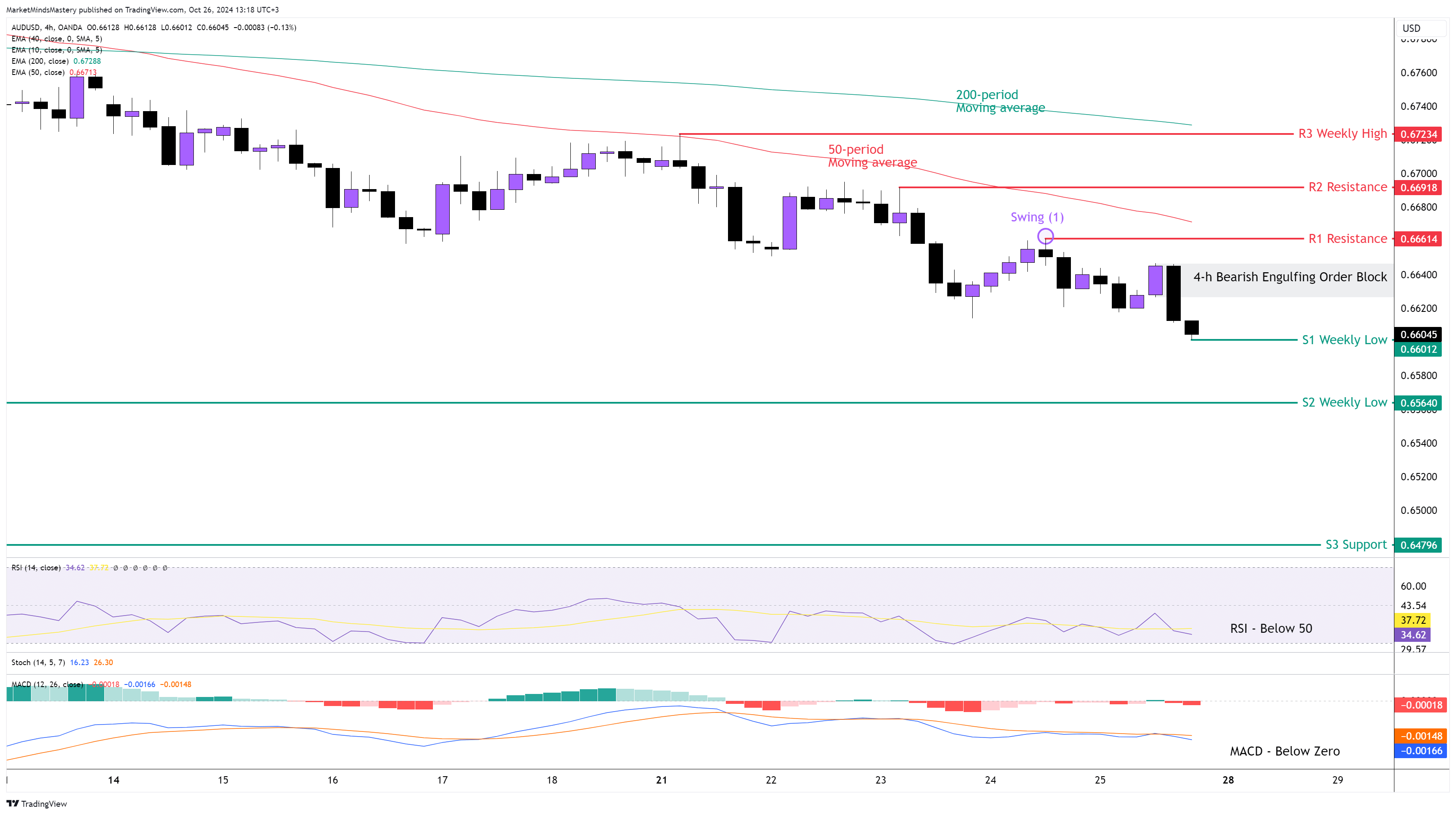 كان ضعف الدولار الأسترالي واضحًا خلال الأسبوع الماضي، وانتهى السعر على الرسم البياني الأسبوعي بشمعة هابطة طويلة، حيث أغلق السعر على الشمعة بالقرب من أدنى مستوياته. أما على الرسم البياني للأربع ساعات، استمر السعر في الانخفاض حتى نهاية جلسة تداول نيويورك، وأنشأ السعر كتلة أوامر هبوطية مبتلعة حول 0.66400. الفترة أقل من المتوسط المتحرك لـ 200 فترة، وهذا أمر هبوطي. ويقع مؤشر القوة النسبية مؤشر القوة النسبية تحت مستوى 50، وهذا هبوطي. يقع مؤشر الماكد MACD تحت خط الصفر، وهذا له آثار هبوطية.