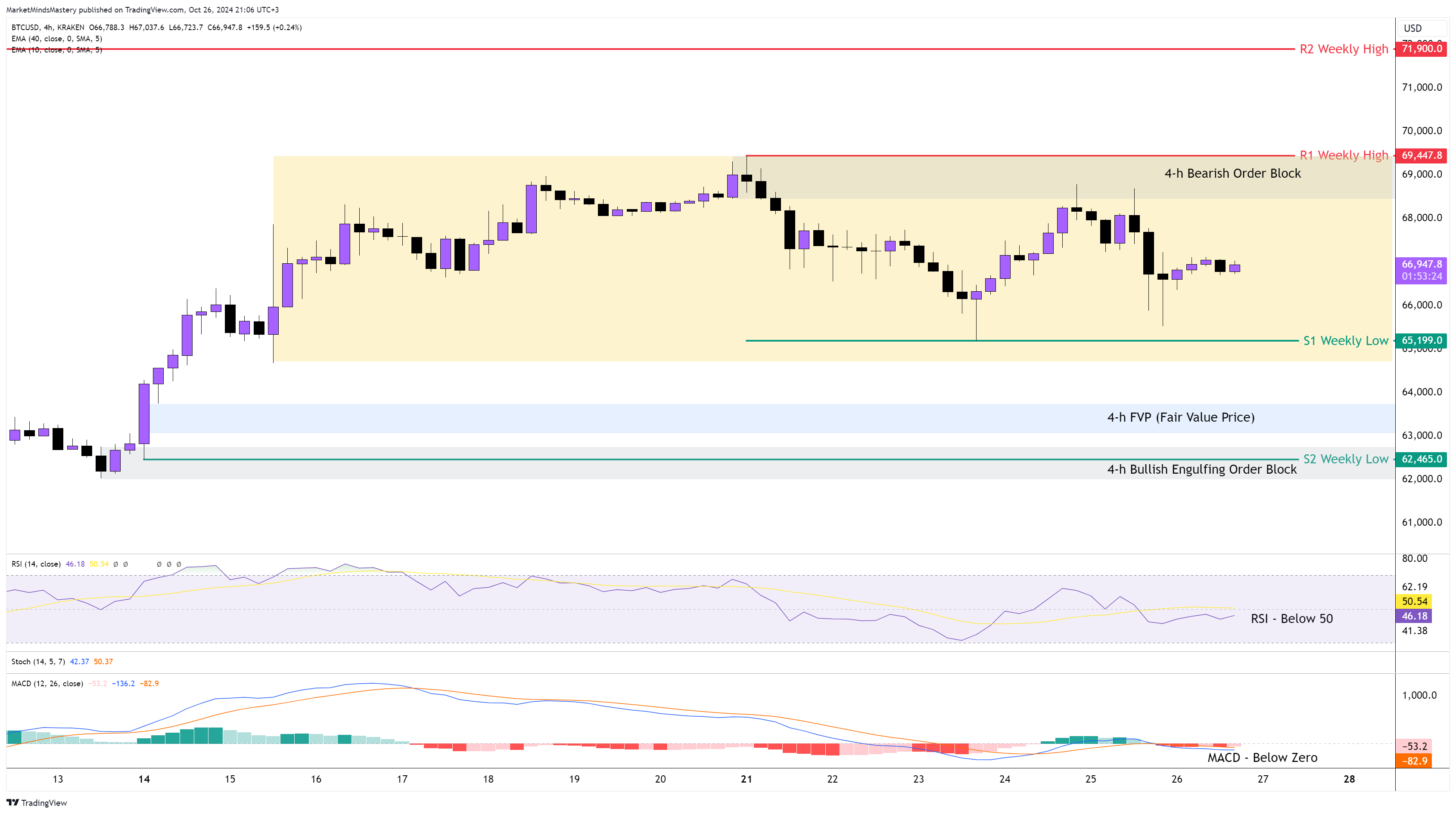 على الرسم البياني لمدة 4 ساعات، كان السعر يتداول في نطاق الأسبوع الماضي، حيث لم يحدث ارتفاع أعلى أو انخفاض أدنى. حدث كتلة أوامر هبوطية لمدة 4 ساعات يوم الإثنين الماضي عند حوالي 69000$، و كتلة أوامر هبوطية (سعر القيمة العادلة) حدثت قبل بضعة أسابيع عند حوالي 63000$، و كتلة أوامر الابتلاع الصعودية عند حوالي 62000$ لا تزال سارية حيث لم يتم اختبار أي منها حتى الآن. يقع مؤشر القوة النسبية RSI Oscillator تحت خط الوسط 50، وهو مؤشر هبوطي. كما أن مؤشر MACD's MACD's Histogram تحت خط الصفر، مما يشير إلى الاتجاه الهابط. بدءًا من يوم الإثنين، إذا تحرك السعر للأسفل، ستكون منطقة الدعم الأولى، S1، عند 65199$، وهو أدنى مستوى للأسبوع السابق وأيضًا قاع النطاق. إذا اخترق السعر S1 واستمر في التحرك لأسفل، ستكون منطقة الدعم التالية، S2، عند 62465$، وهو مستوى أسبوعي أقدم.&bsp;وعلى العكس، إذا تحرك السعر لأعلى، ستكون منطقة المقاومة الأولى، R1، عند 69477$، وهو أعلى مستوى للأسبوع السابق. إذا اخترق السعر R1 واستمر في الارتفاع، فإن منطقة المقاومة التالية، R2، ستكون عند 71900 دولار.