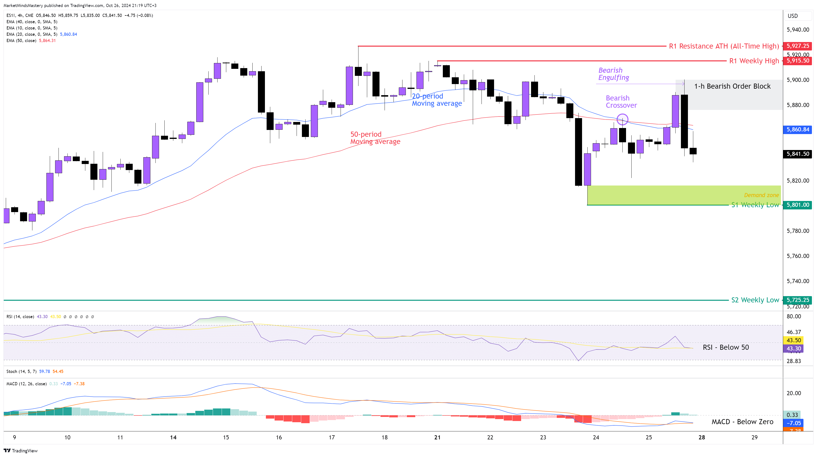 إذا ارتد السعر وتحرك لأعلى، فستكون منطقة المقاومة الأولى، R1، عند 5915 دولارًا، وهي أيضًا قمة الأسبوع السابق. إذا اخترق السعر R1 وواصل التحرك لأعلى، فستكون منطقة المقاومة التالية، R2، هي منطقة المقاومة التالية R2 عند 5927.25 دولارًا أمريكيًا.