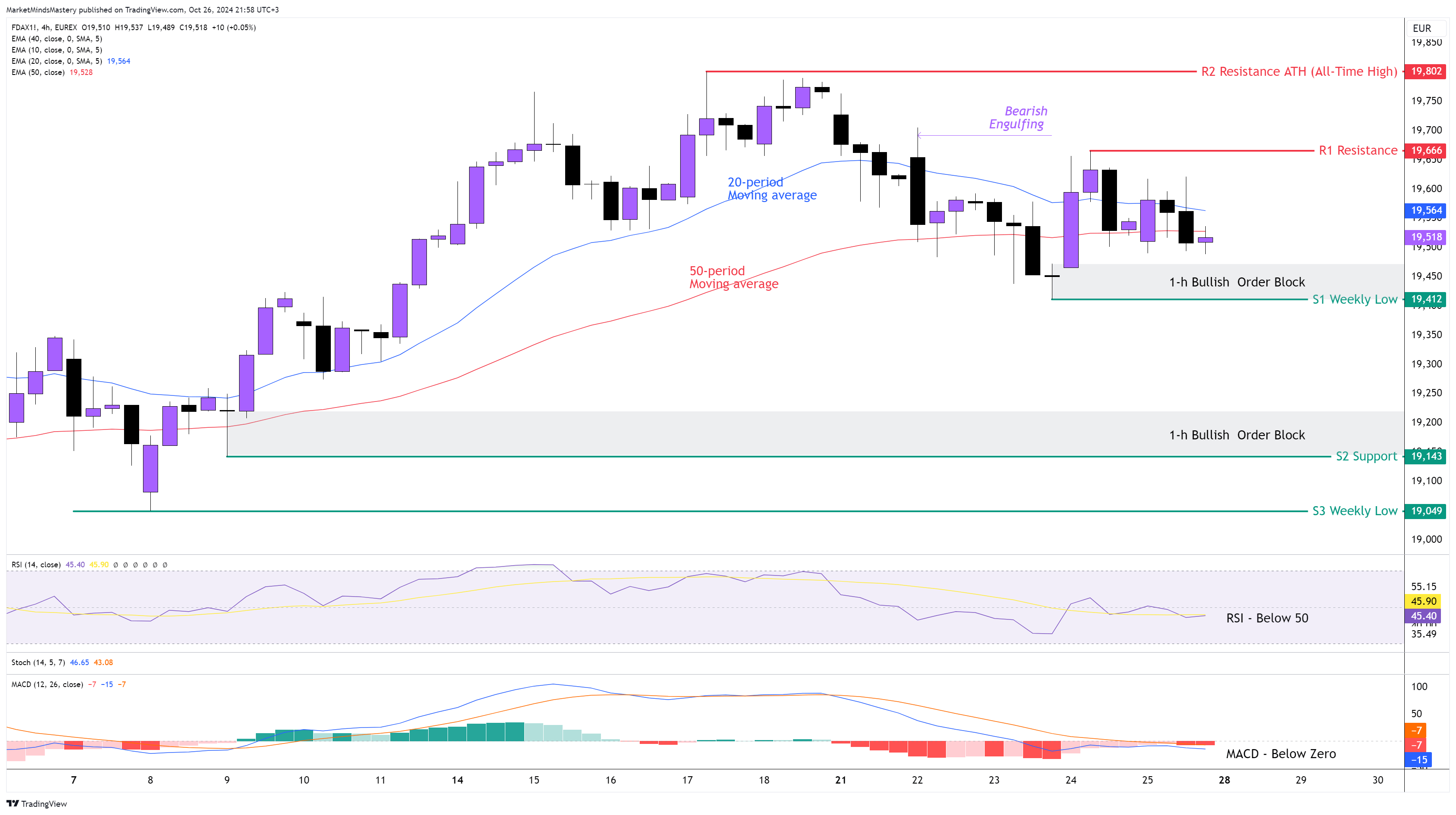 من ناحية أخرى، إذا وجد السعر الدعم وارتد وتحرك لأعلى وفقًا لتحليل المتوسطات المتحركة، ستكون منطقة المقاومة الأولى، R1، هي 19666. إذا اخترق السعر R1 واستمر في التحرك لأعلى، فإن منطقة المقاومة التالية، R2، ستكون منطقة المقاومة التالية R2 هي منطقة R1 (أعلى مستوى على الإطلاق) عند 19802، كما نشير إلى ذلك على الرسم البياني.