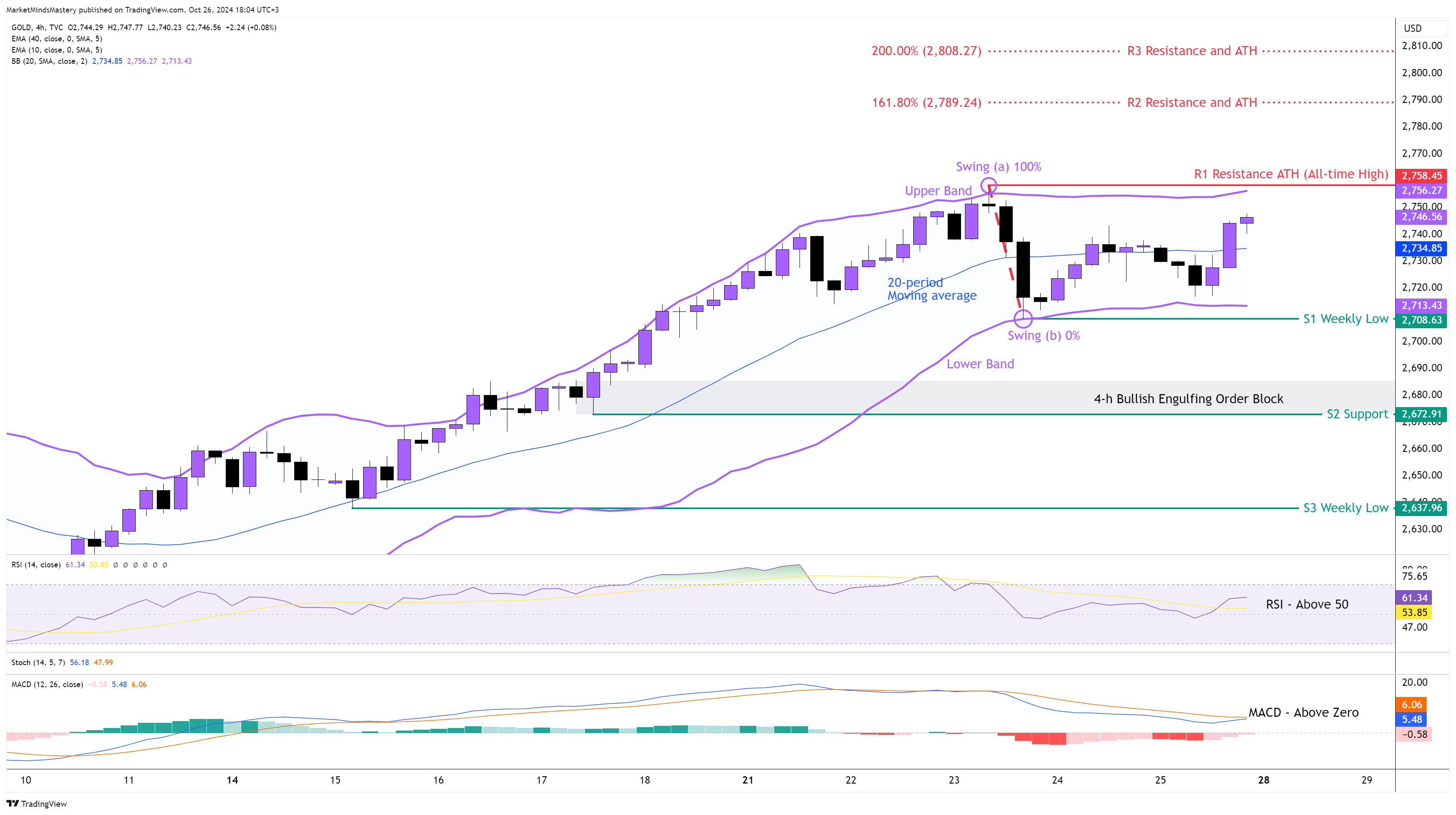 على الرغم من أن جميع المتداولين ينتظرون تصحيحًا عميقًا للأسعار، إلا أن سعر الذهب لأسبوع آخر خلق سعرًا جديدًا (أعلى مستوى على الإطلاق). على الرسم البياني لفترة 4 ساعات، منذ يوم الأربعاء الماضي، يتداول السعر داخل نطاق تداول. باستخدام مؤشر بولينجر باند، فإن النطاق العلوي موازٍ للنطاق السفلي، مما يشير إلى أن السعر في حالة توازن مع تساوي قوى العرض والطلب. يقع مؤشر RSI مذبذب فوق مستوى 50، مما يشير إلى الاتجاه الصعودي. يقع مؤشر MACD فوق خط الصفر، وهو مؤشر صعودي. في الوقت الحالي، يقع السعر فوق المتوسط المتحرك لفترة 20، وهو منتصف مؤشر بولينجر باند. وبالتالي، إذا تحرك السعر لأعلى، فستكون منطقة المقاومة الأولى، R1، هي منطقة المقاومة R1 (أعلى مستوى على الإطلاق) عند 2758 دولارًا. إذا اخترق السعر R1 واستمر في التحرك لأعلى، فستكون منطقة المقاومة التالية، R2، عند 2789 دولارًا. هذه هي منطقة امتداد فيبوناتشي 161.8% فيبوناتشي التي تقيس من التأرجح عند النقطة (أ) إلى التأرجح عند النقطة (ب)، كما هو موضح على الرسم البياني.