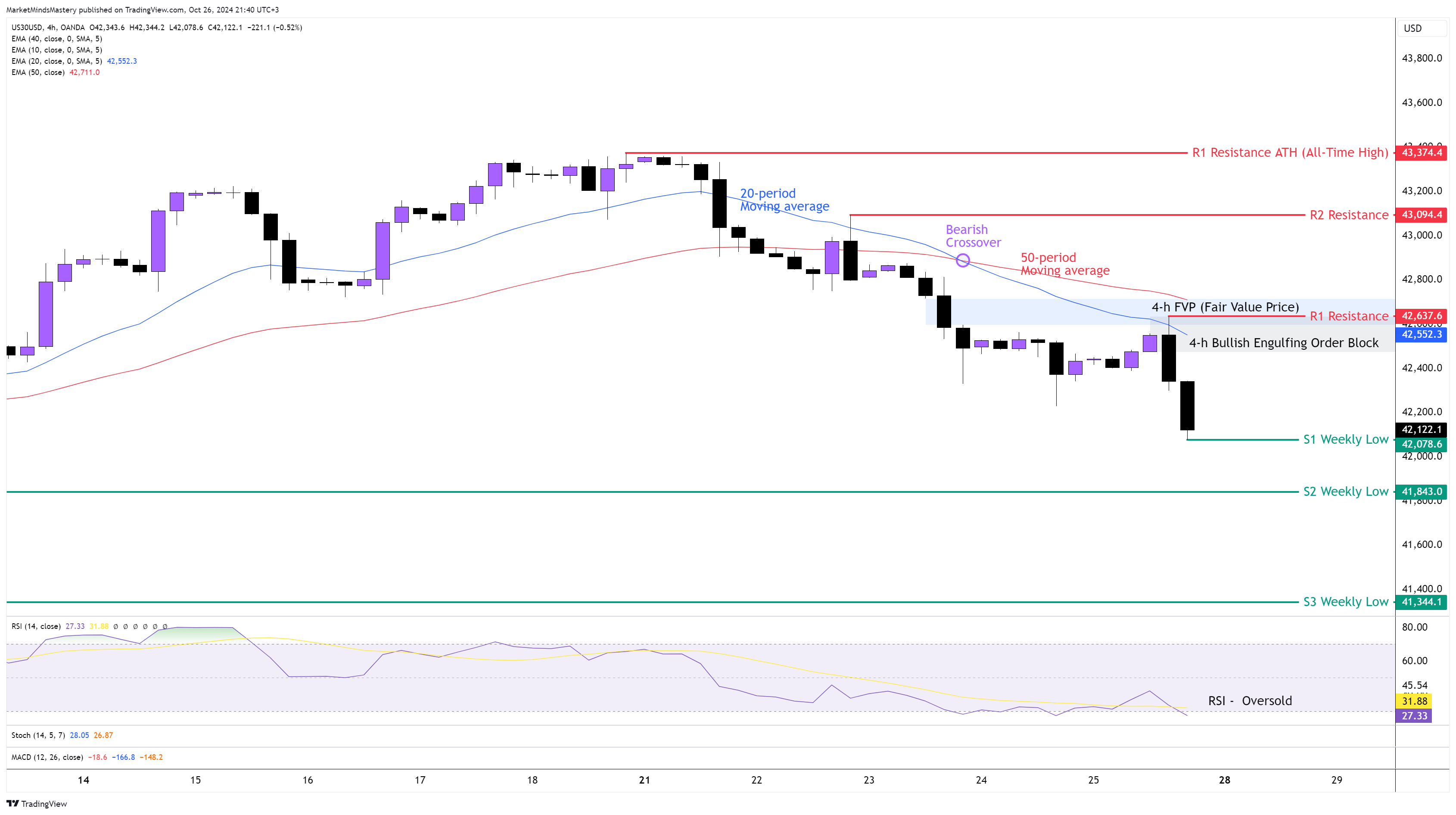 ابتداءً من يوم الاثنين، إذا استمر السعر في التحرك لأسفل، فإن منطقة الدعم الأولى، S1، ستكون 42078 دولار، وهو أدنى مستوى في الأسبوع السابق. إذا اخترق السعر S1 واستمر في التحرك لأسفل، فإن منطقة الدعم التالية، S2، ستكون حول 41843$، وهو مستوى أسبوعي أقدم. إذا اخترق السعر S2 واستمر في التحرك للأسفل، فستكون منطقة الدعم التالية، S3، حول 41344 دولارًا أمريكيًا. يعتبر هذا المستوى مستوى مقاومة رئيسي حيث يتكون من كتلة الأوامر الهبوطية الهبوطية، والتي تم إنشاؤها يوم الجمعة الماضي خلال جلسة تداول نيويورك، و4-ح (سعر القيمة العادلة)، والتي تم إنشاؤها يوم الأربعاء الماضي، والمتوسط المتحرك لـ20 فترة.