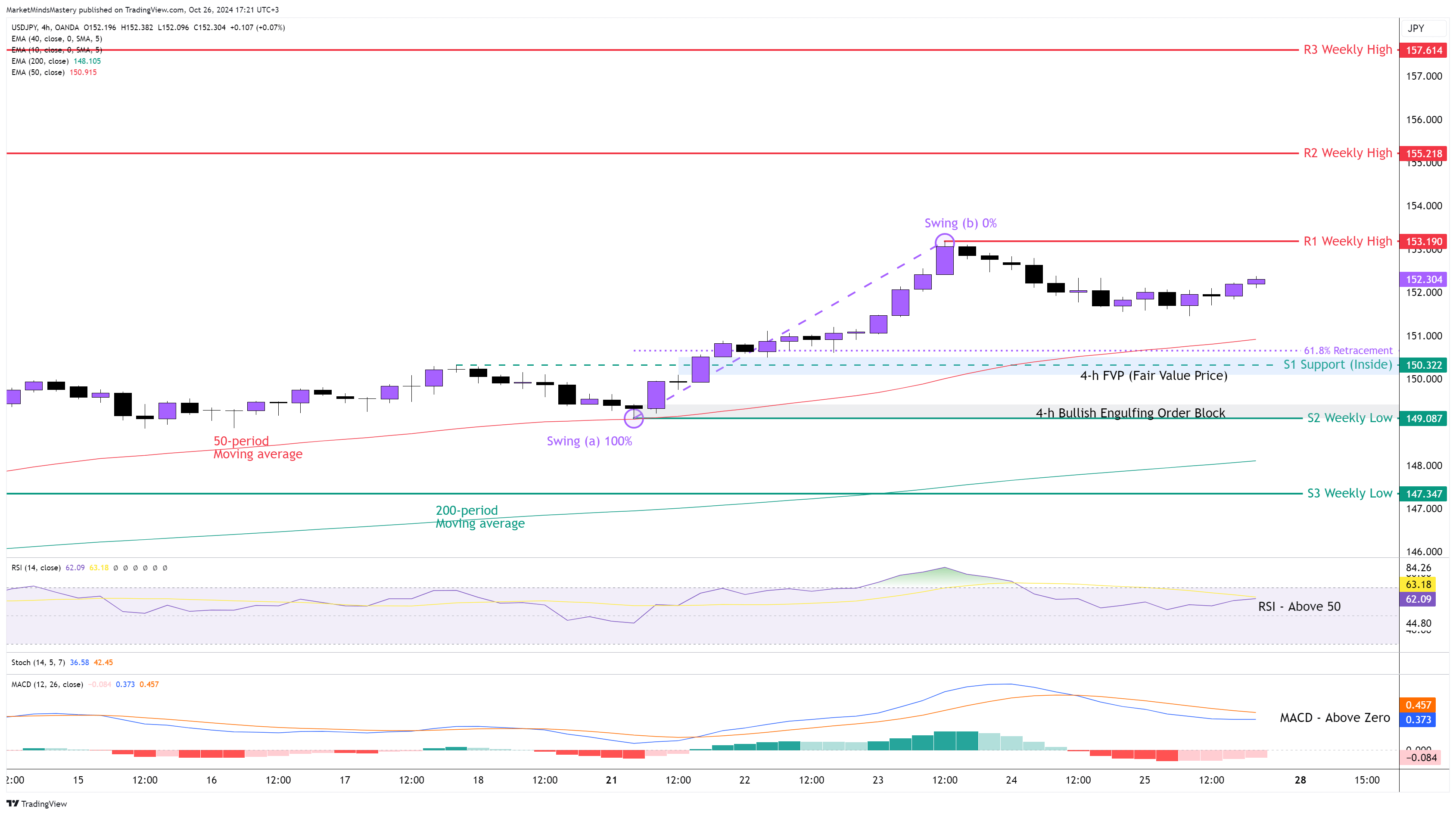 كما أوضحنا في تحليلات السوق السابقة، فإن التباعدات السلبية التي حددناها في توقعات السوق الأسبوع الماضي أجبرت السعر على الدخول في مرحلة الارتداد. استمر سعر الدولار الأمريكي مقابل الين الياباني في التحرك لأعلى، مما أدى إلى تكوين قمة جديدة على المخطط الأسبوعي. على المخطط البياني للأربع ساعات، دخل السعر يوم الإثنين منطقة الطلب التي أشرنا إليها على المخطط الأسبوع الماضي، وارتد منها ثم تحرك لأعلى، مما أدى إلى خلق اتجاه صعودي لمدة 4 ساعات. لا يزال المتوسط المتحرك لـ فوق المتوسط المتحرك لـ 200 فترة، وهذا أمر صعودي. يقع مؤشر القوة النسبية فوق خط الوسط 50، مما يشير إلى الاتجاه الصعودي. يقع مؤشر MACD فوق خط الصفر، وهو ما يشير إلى الاتجاه الصعودي. إذا استمر السعر في التحرك لأعلى، فإن منطقة المقاومة الأولى، R1، ستكون حول 153.190، وهي قمة الأسبوع السابق. وإذا اخترق السعر R1 واستمر في الصعود، ستكون منطقة المقاومة التالية، R2، عند 155.218. وفي حال تحرك السعر للأسفل ليبدأ مرحلة ارتداد، ستكون منطقة الدعم الأولى، S1، هي منطقة الدعم الداخلي عند مستوى 150.322.