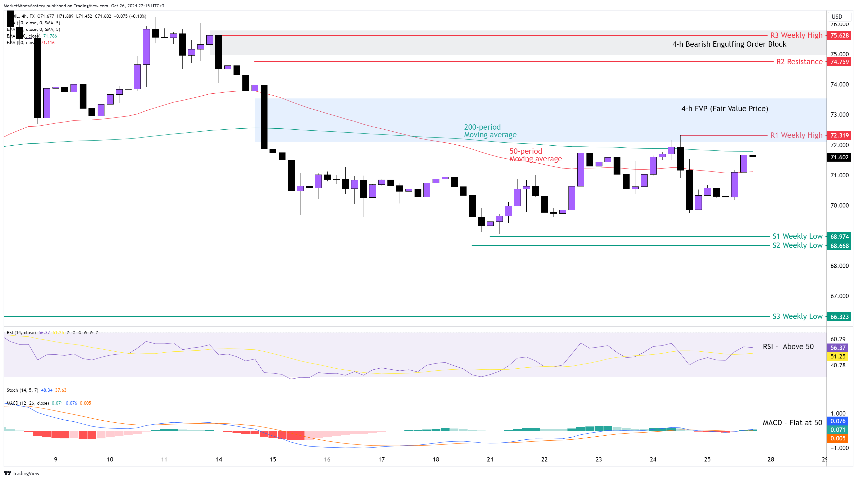من ناحية أخرى، إذا تحرك السعر لأعلى، فإن منطقة المقاومة الأولى، R1، ستكون عند 72.31$، وهي قمة الأسبوع السابق. إذا اخترق السعر R1 واستمر في الارتفاع، فإن منطقة المقاومة التالية، R2، ستكون عند 74.75 دولارًا أمريكيًا.