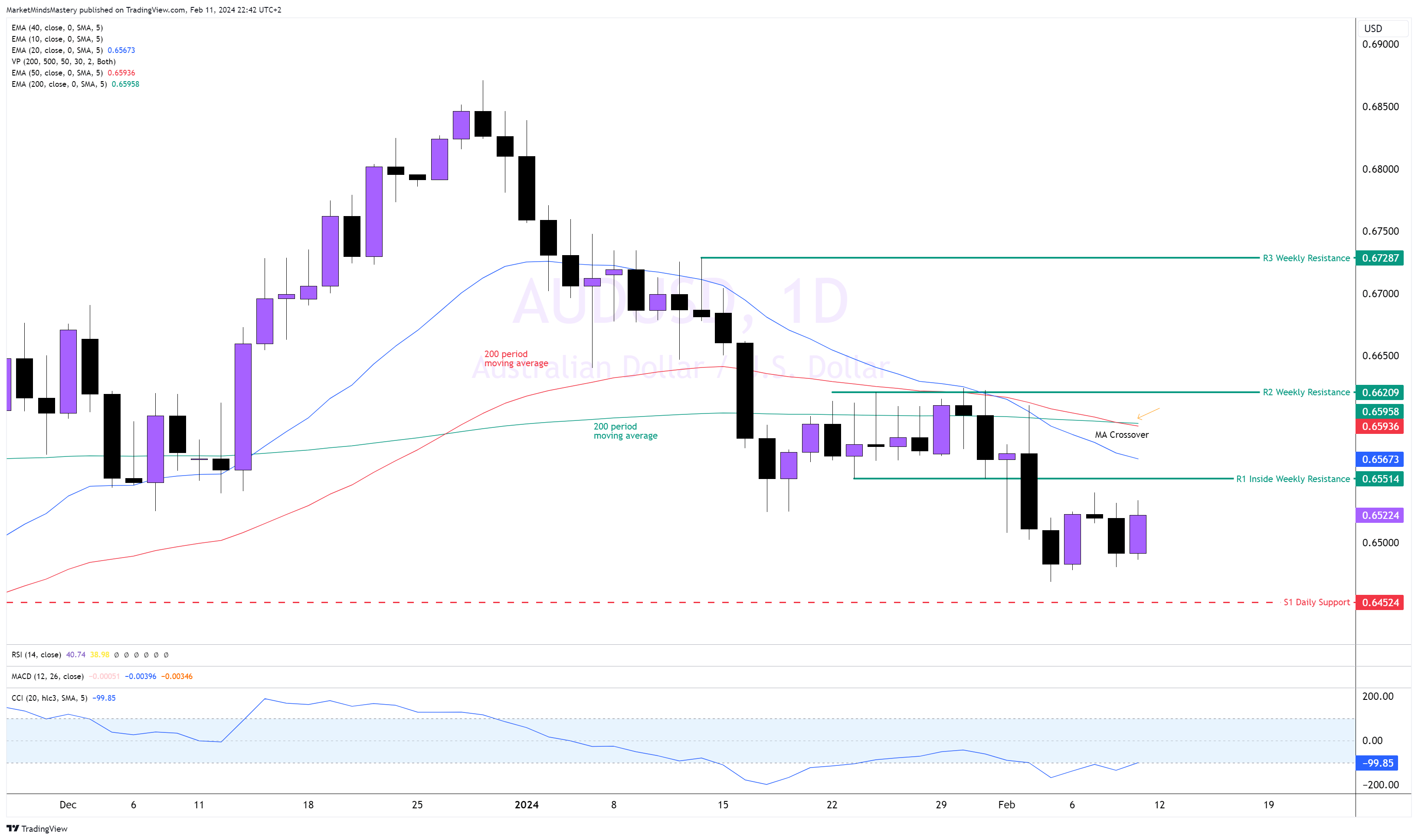 في أعقاب انخفاض السعر الذي بدأ في أوائل شهر يناير/كانون الثاني، سجل السعر قمم منخفضة وقيعان منخفضة. وتخطى المتوسط المتحرك لـ 50 فترة دون المتوسط المتحرك لـ 200 فترة، وهو مؤشر هبوطي. يتم تداول مؤشر الماكد تحت خط الصفر، وهو أيضًا مؤشر هبوطي. إذا تحرك السعر لأعلى، فإن منطقة المقاومة الأولى، R1، هي مقاومة أسبوعية داخلية، حوالي 0.65514. تصبح المقاومة الديناميكية التالية هي المتوسط المتحرك إذا اخترق السعر R1 وأغلق فوقه. عادة، عندما تكون الأسواق في اتجاه، تعمل المتوسطات المتحركة كمناطق مقاومة. وعلى العكس من ذلك، إذا انخفض السعر وتحرك لأسفل، تقع منطقة الدعم الأولى، S1، حول مستوى 0.64524. ويمكن أن يؤدي الاختراق أدناه إلى العثور على الدعم، S2، عند مستوى 0.63473 تقريبًا.
