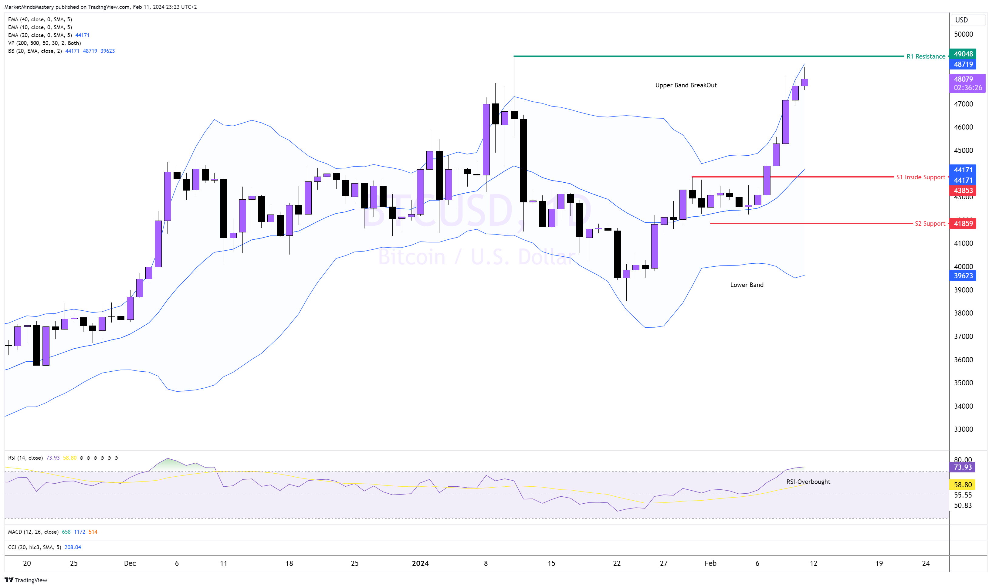 بعد الحركة الجانبية، تم تداول السعر بين 42,000 دولار و43,500 دولار. اخترق السعر وتحرك صعودًا منذ تداولات الأسبوع الماضي، وهو قريب جدًا حاليًا من 49,000 دولار. السعر "يسير في النطاق العلوي"، مما يدل على سيطرة المشترين على السوق. مؤشر القوة النسبية RSI في منطقة ذروة الشراء، مما يشير إلى ميل صعودي. إذا استمر السعر في الارتفاع، فإن المقاومة الأولى، R1، تقع حول 49,000 دولار. يمكن أن يؤدي الاختراق والإغلاق فوقها إلى دفع السعر إلى منطقة المقاومة التالية، R2، حوالي 52,000 دولار. في حالة انخفاض السعر وتحركه للأسفل، فإن الدعم الداخلي S1 هو الدعم الأول في السوق عند مستوى 43,850 دولار. إذا انخفض السعر أكثر من ذلك، فإن منطقة الدعم التالية، S2، تبلغ 41,850 دولارًا تقريبًا.