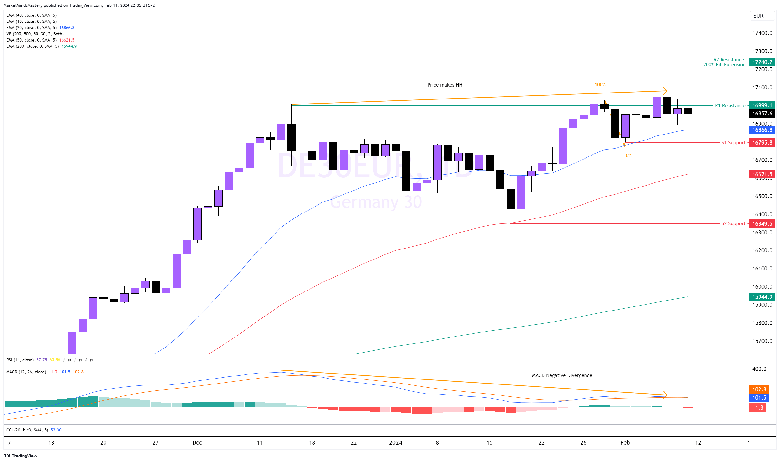 يرتفع سعر الإنديكي الألماني مع سلسلة من القمم المرتفعة والقيعان المرتفعة. وبشكل عام، هذا سوق صاعد بشكل عام. طبع مؤشر MACD تباعدًا هبوطيًا أو سلبيًا على هذه القمة الأخيرة الأخيرة، مما يشير إلى أن السعر يواصل الارتفاع بزخم أقل من الحركة الصعودية المندفعة السابقة. وهذا يمكن أن يضع السعر في تصحيح قصير الأجل. ومع ذلك، لا يزال السعر في اتجاه صعودي. كما أنه يستقر أيضًا فوق المتوسط المتحرك لـ20 فترة، وهو اتجاه صعودي، ولم ينكسر هيكل السوق. ولذلك، إذا استمر السعر في الارتفاع، يمكن تقدير منطقة المقاومة التالية باستخدام امتداد فيبوناتشي 200% حيث أن السعر عند أعلى مستوى له على الإطلاق، دون الرجوع إلى الماضي القريب. وعلى النقيض من ذلك، إذا انخفض السعر وتحرك السعر للأسفل، يمكن تقدير منطقة الدعم الأولى، S1، حول 16795. إذا اخترق السعر S1 وتحرك لأسفل، فإن الدعم التالي، S2، يمكن أن يكون 16349.