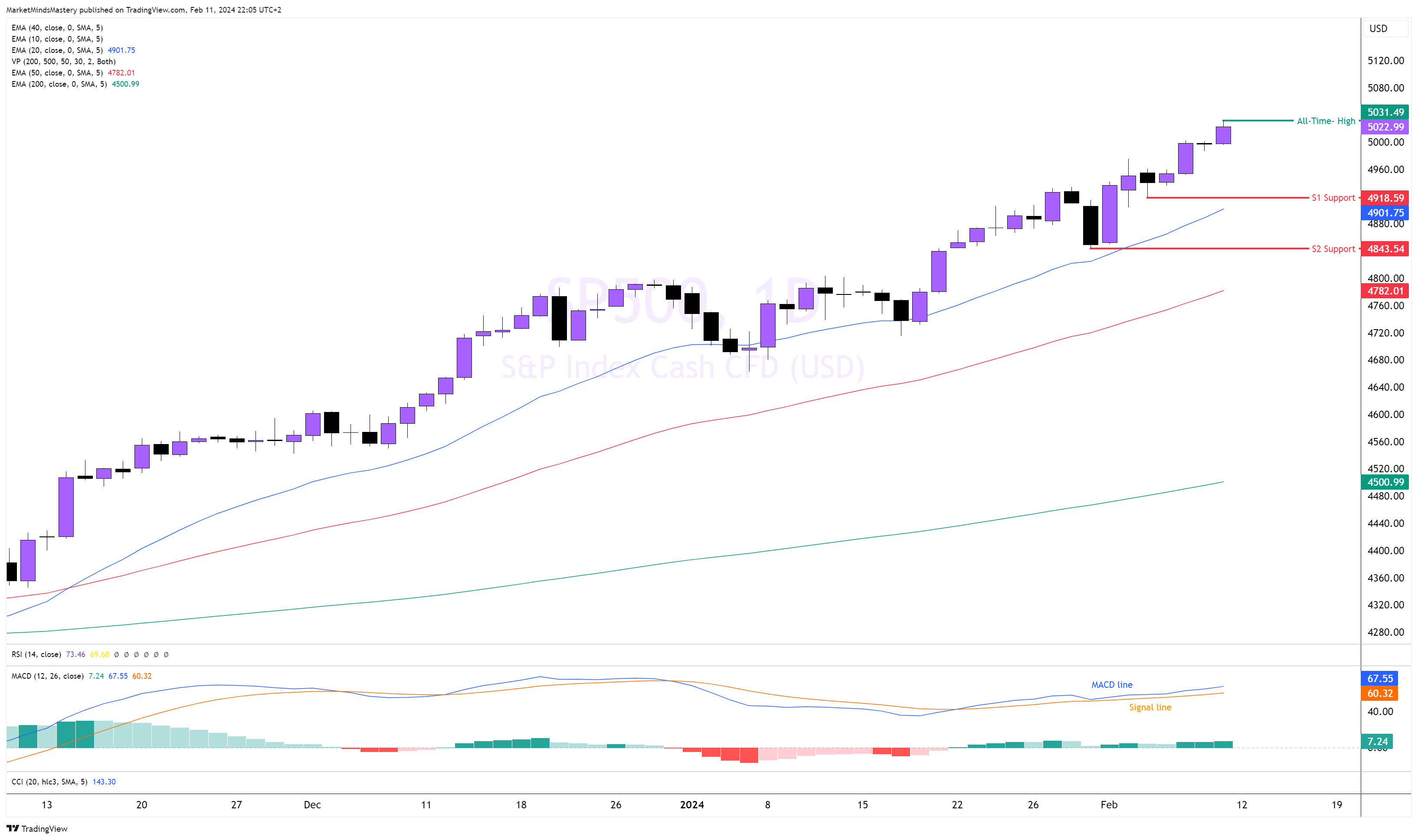 سجل مؤشر SP500 أعلى مستوى جديد على الإطلاق يوم الجمعة الماضي، كما فعل الأسبوع الماضي، ووصل المؤشر إلى منطقة 5031. لا يزال السوق في اتجاه صعودي واضح المعالم وراسخ. جميع المتوسطات المتحركة الثلاثة في حالة جيدة، مع بقاء المتوسط المتحرك لفترة 20 فوق المتوسط المتحرك 50 والمتوسط المتحرك 50 فوق المتوسط المتحرك 200. الثلاثة منفصلة بشكل جيد، وهذا مؤشر صعودي. يقع خط MACD (باللون الأزرق) فوق خط الإشارة (باللون البرتقالي)، وكلاهما فوق خط الصفر، وهو أيضًا مؤشر صعودي. تطبع حركة السعر على الرسم البياني شموعًا صاعدة طويلة، مما يشير إلى أن المشترين يسيطرون بشكل رئيسي على هذا السوق. عمليات الاسترداد ضحلة وقصيرة المدة، وفقًا للشموع السوداء.