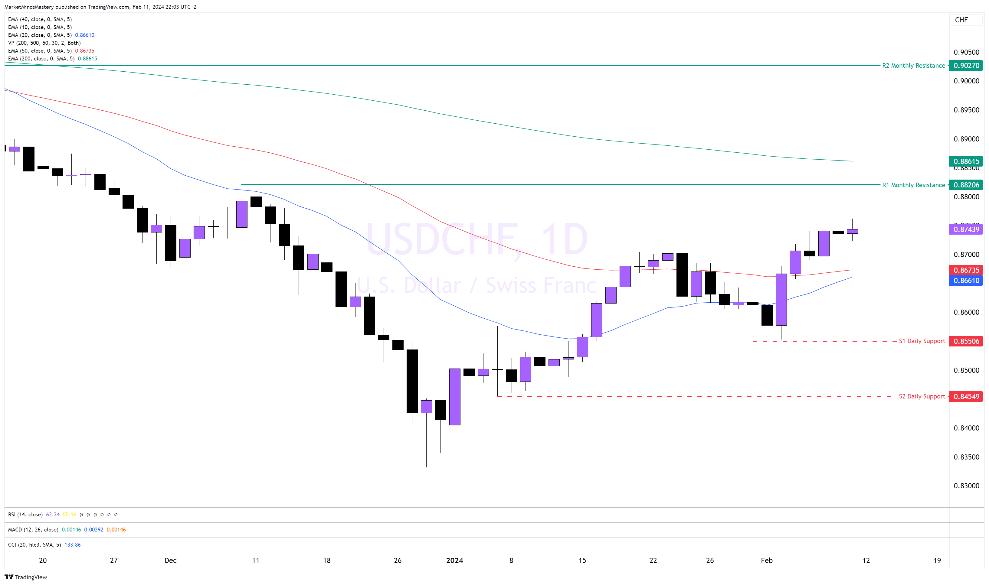 في الأسبوع الماضي، كان السويسري من أضعف العملات خلال الأسبوع الماضي. تسبب ذلك في ارتفاع زوج الدولار الأمريكي/الفرنك السويسري USDCHF، متجاوزًا المتوسط المتحرك لـ 50 فترة وارتفاعه. يتداول السعر فوق المتوسط المتحرك المتحرك 50، مكونًا قمة أعلى وقاع أعلى. ويقع مؤشر القوة النسبية فوق مستوى 50، مما يشير إلى اتجاه صعودي;