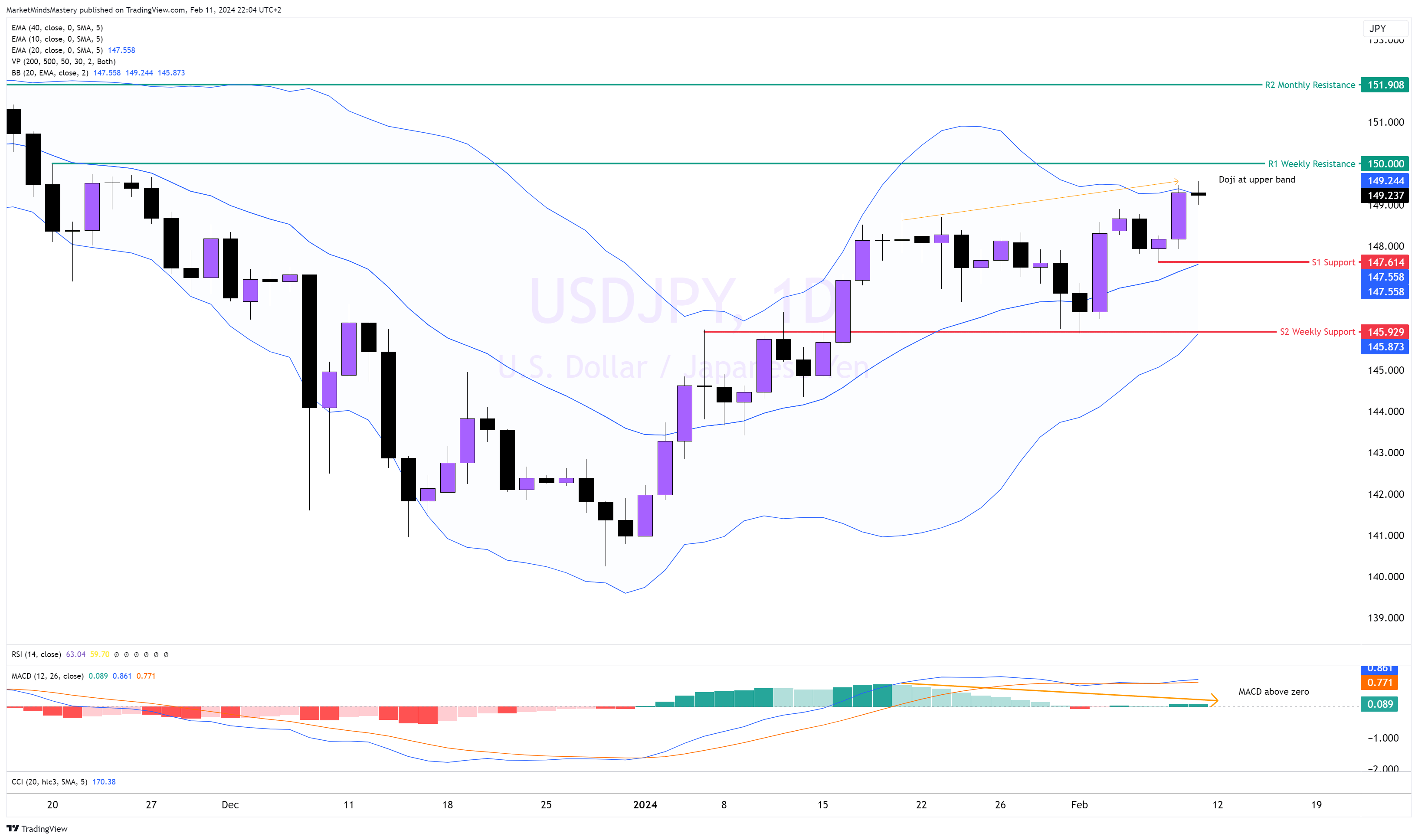 من الناحية الأساسية، من المتوقع أن يكون الدولار الأمريكي عملة ضعيفة، ومن المتوقع أن يتحسن الناتج المحلي الإجمالي في اليابان. ولذلك، إذا كانت الأحداث على مستوى الاقتصاد الكلي تصب في صالح الين وفي الوقت نفسه في الولايات المتحدة، فإن الدولار الأمريكي يضعف. وبالتالي، من المحتمل أن يشهد الدولار الأمريكي مقابل الين الياباني انخفاضًا على المدى القصير. لا يزال السعر يسجل قممًا مرتفعة وقيعانًا مرتفعة. ويتم تداوله فوق المتوسط المتحرك لـ 20 فترة، مما يشير إلى اتجاه صعودي. يظهر مؤشر الماكد أيضًا تحيزًا صعوديًا، حيث يسجل المدرج التكراري تباعدًا هبوطيًا. تُظهر حركة السعر شمعة دوجي بعد شمعة صاعدة طويلة داخل الاتجاه الصاعد مباشرة. إذا تحرك السعر هبوطيًا بشكل مؤقت، ستكون منطقة الدعم الأولى هي المتوسط المتحرك الديناميكي لـ 20 فترة لمؤشر بولينجر باند. إذا تحرك السعر أسفله، ستجد دعم S1 حول 147.614.
