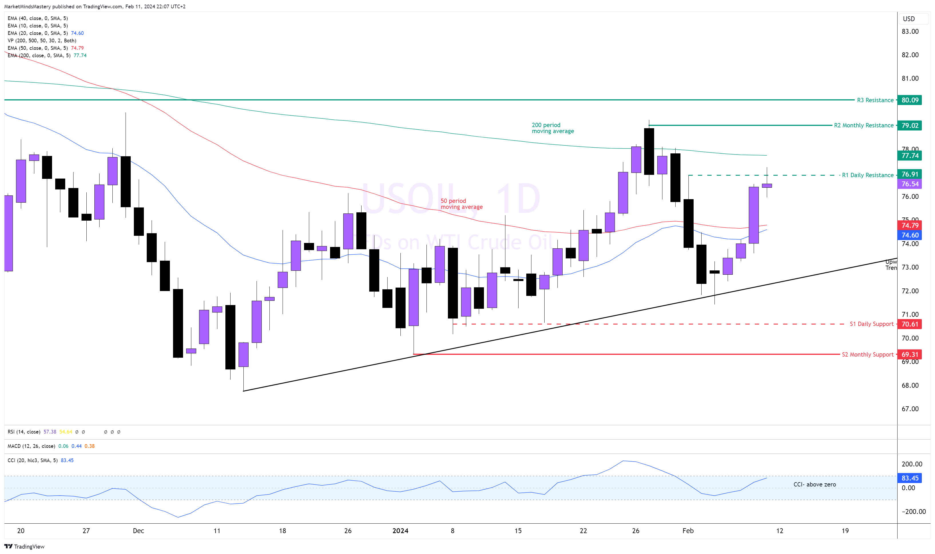 يتم تداول سعر USOIL فوق المتوسط المتحرك لـ 50 فترة. يتجه السوق نحو الهبوط حيث أن الفترة 50 أقل من المتوسط المتحرك لـ 200 فترة. قبل بضعة أسابيع، تم رفض السعر بمجرد تفاعله مع المتوسط المتحرك لـ 200 فترة. الحركة الصعودية للسعر تؤسس خط اتجاه صاعد متوسط T1. وبناءً على كل ذلك، فإن الاتجاه الأساسي هابط، والاتجاه الوسيط صاعد. مؤشر قناة السلع (CCI) فوق الصفر، وهو صعودي. المتوسط المتحرك لـ 200 فترة هو المقاومة الديناميكية الأولى إذا استمر السعر في التحرك لأعلى. وإذا استمر السعر في الارتفاع سيجد المقاومة الشهرية، R2، حول مستوى 79 دولارًا. وإذا اخترق السعر قمة التأرجح الأخيرة وتحرك لأعلى، ستكون المقاومة التالية حول 80 دولارًا. وعلى العكس من ذلك، إذا تحرك السعر للأسفل وأغلق تحت المتوسط المتحرك لـ 50 فترة، يمكن أن يعمل خط الاتجاه الصاعد T1 كدعم. إذا اخترق السعر خط T1 بشكل حاسم، فإن أول دعم ثابت، S1، هو المنطقة حول 70 دولارًا;