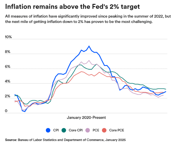 Inflation remains stubbornly above the Fed’s 2% target, though there are signs of gradual cooling.