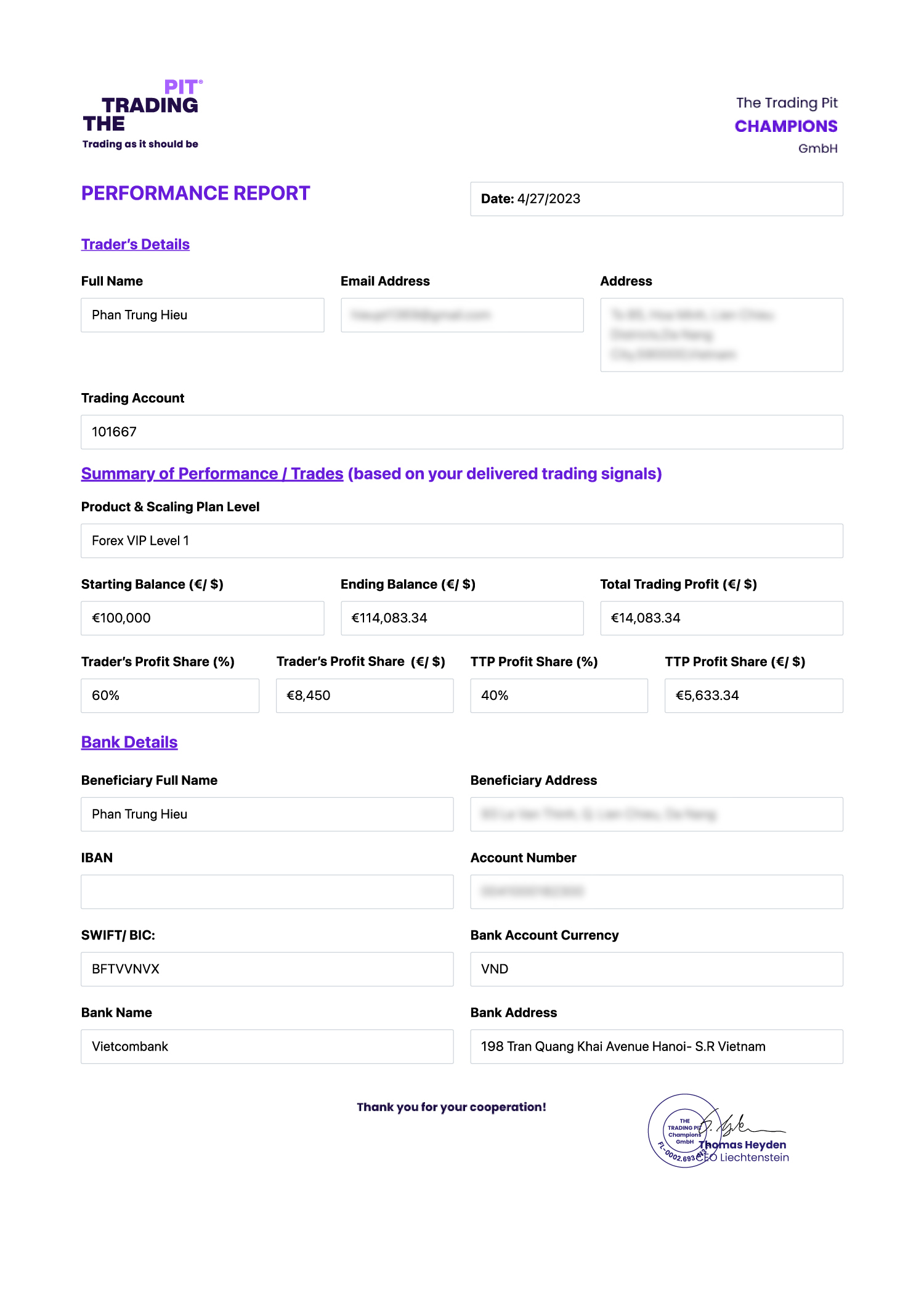 Meet Phan Trung Hieu, a successful trader from Vietnam who recently completed The Trading Pit’s Forex VIP Challenge in a record-breaking 13 days. With his impressive trading skills, Hieu quickly advanced to the Scaling Plan and received his first payout of 8,450 Euros in just 5 days. Now at Level 2 and continuing to excel, Hieu shares his trading strategies and experiences with The Trading Pit team in this inspiring success story.