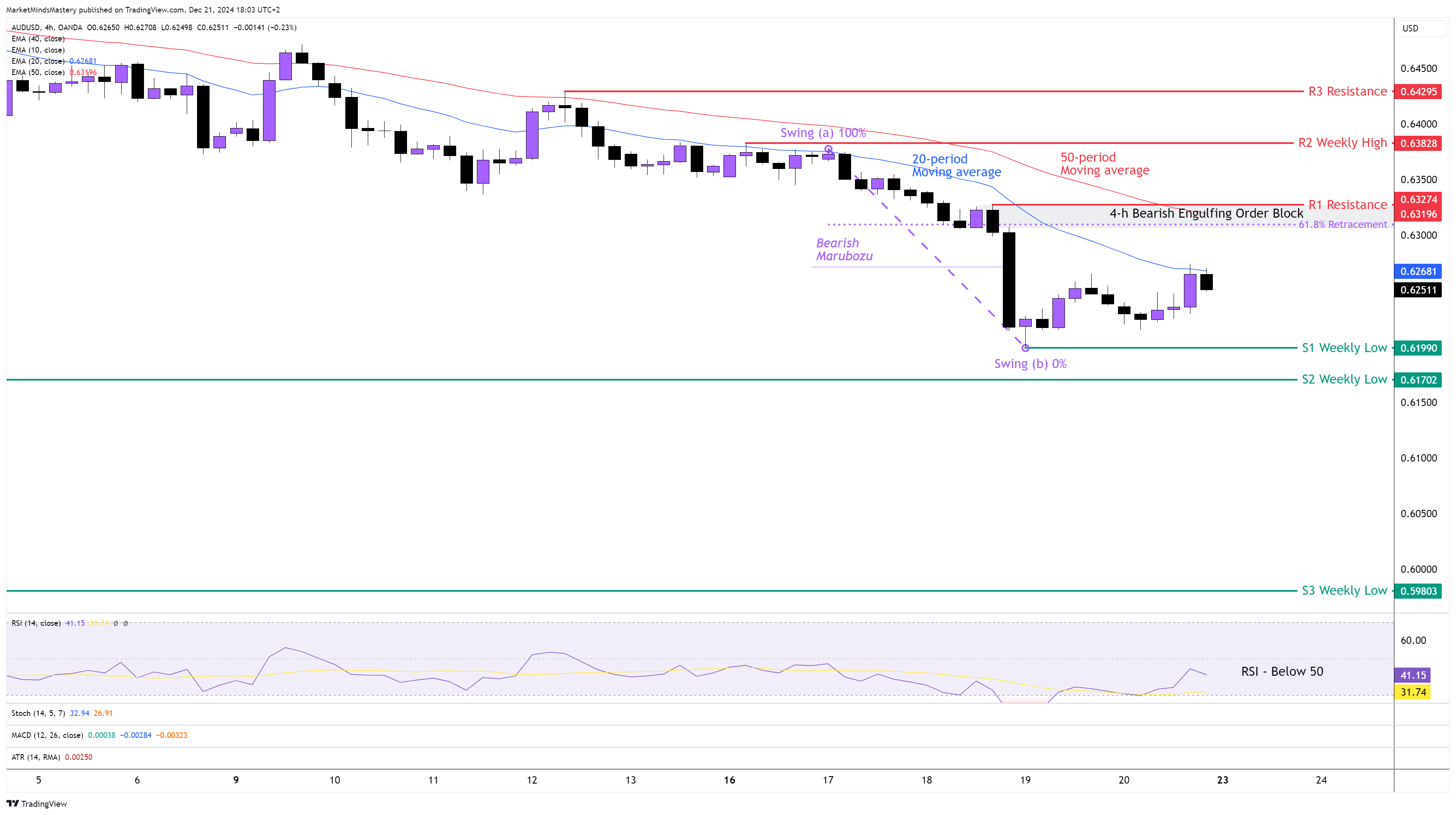 Oppositely, if the price starts a retracement phase, it means that it will start moving upwards. In this case, the first resistance area, R1, will be around 0.63274. This is considered a key level of resistance as it coinsists off the Bearish Engulfing Order Block created last Wednesday, the 50-period moving average, and the 61.8% Golden Ratio of Fibonacci if we measure the swing at point (a) until the swing at point (b). If the price penetrates the R1 and keeps moving upwards, the next resistance area, R2, will be at 0.6382, which is the previous week's high.