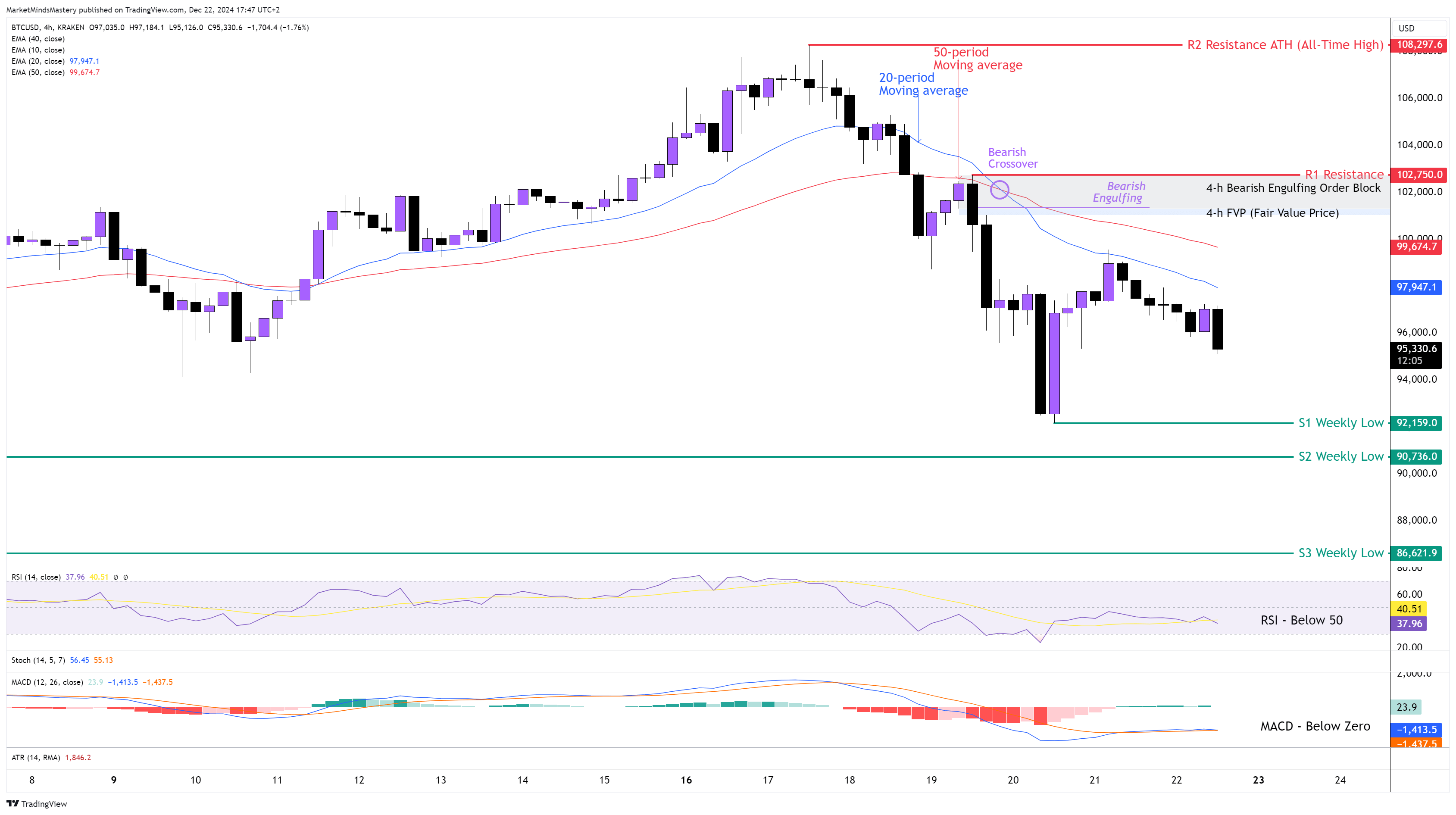 On the other hand, if the price bounces off and starts to move upwards, the first resistance area, R1, will be at $102750. This is considered a key level of resistance as it consists of the Bearish Engulfing Order Block and the FVP (Fair Value Price) created last Thursday. If the price penetrates the R1 and keeps moving upwards, then the next resistance area, R2, will be the ATH at $108297.