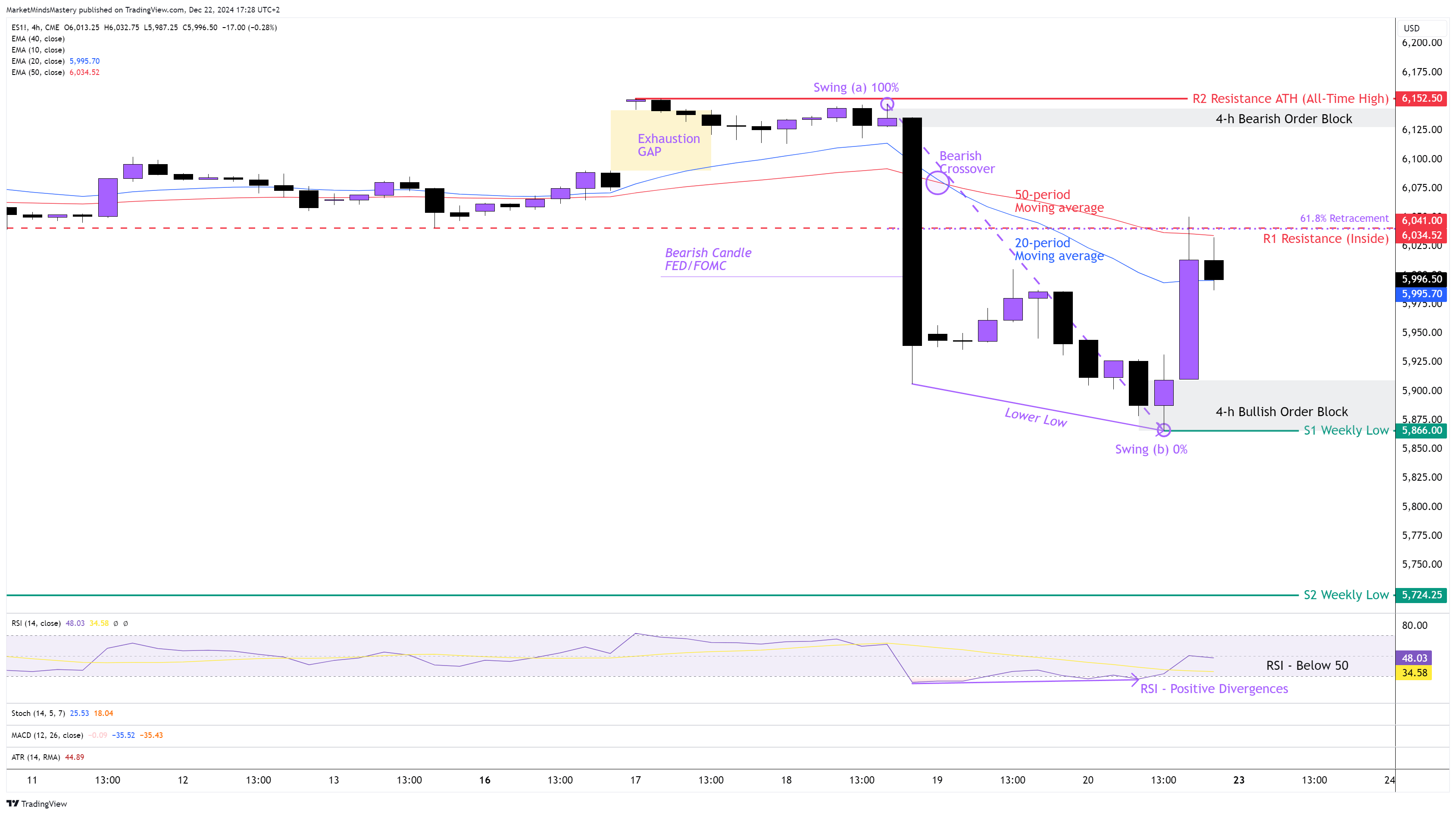 Last week, the price of the SP500 created a new ATH (All-Time High) at $6152.75. The weekly candle didn’t close above the previous week’s high, and this is a point of weakness in the SP500 market. The primary trend is still an uptrend. On the 4-hour chart, the price Gapped Up on Monday’s opening, but the gap “filled” last Wednesday with a Long Bearish candle during the FED’s announcement of the Interest Rates and FOMC minutes in the US. That caused the 20-period to cross below the 50-period moving average, known as a Bearish Crossover. Last Friday, the price created a Lower Low formation, but simultaneously, the RSI Oscillator showed Positive (or Bullish) Divergences, and that pushed the price upwards. Last Friday, the price rejected the 50-period moving average, the Inside Resistance R1, and the 61.8% Fibonacci Golden Ratio if we measure from the swing at point (a) until the swing at point (b). Therefore, if the price keeps moving downwards, the first support area, S1, will be at $5866, which is the previous week’s low. At this price level, a bullish order block was created last Friday and hasn’t been tested yet. If the price penetrates the S1 and keeps moving downwards, the next support area, S2, will be at $5724.25, which is an older weekly level. Conversely, if the price bounces off and moves upwards, the first resistance area, R1, will still be the Inside Resistance at $6034.52. If the price surpasses the R1 and keeps moving upwards, the next resistance area, R2, will be the ATH at $6152.50. Right under the R2 resistance, the price formed a Bearish Order Block, which can add more resistance to the price.