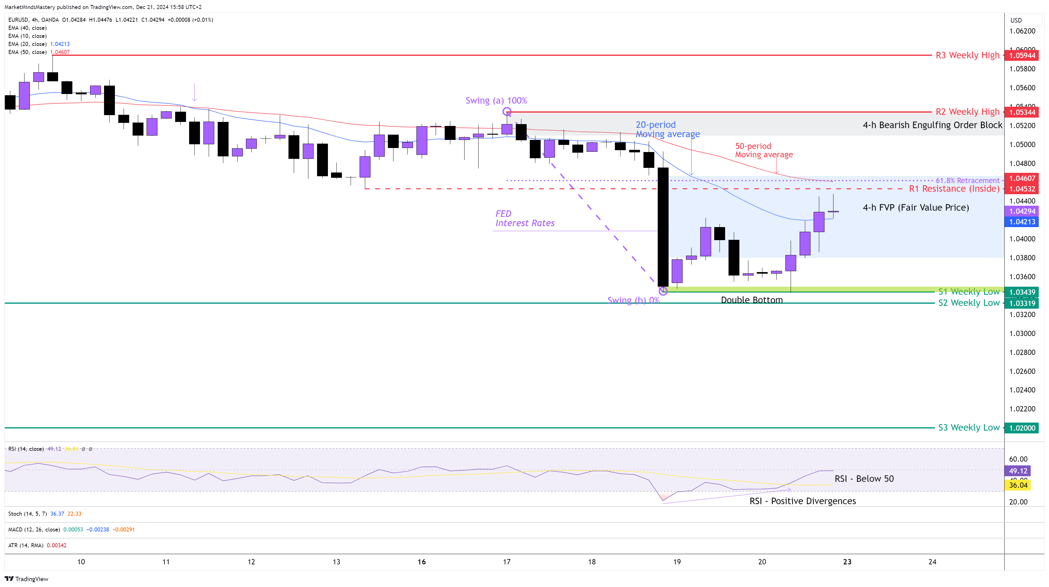 Last week, the price of the EURUSD kept moving lower, as expected. This is because, on the weekly chart, the major trend is a downtrend, and the candlestick was an Inside Bearish candlestick, which had a higher probability of pushing the price lower and resuming the existing trend. On the 4-hour chart, the price made a lower high and lower low formation. Last Wednesday, after the Fed reported the interest rates in the U.S., the price dropped by 1500 points (150 pips). The 20-period moving average is below the 50-period moving average, which is bearish. Last Friday, the price created a Double Bottom formation, and the RSI oscillator printed Positive Divergences. As the RSI remains below its middle line of 50, it has bearish implications. Currently, the price is within the FVP (Fair Value Price). Starting Monday, if the price keeps moving upward, the first area of resistance, R1, will be an Inside Resistance at 1.04532. This is considered as a key level of resistance because it coincides with the 61.8% Golden Ratio of Fibonacci measuring the swing from point (a) to point (b) and the 50-period moving average. If the price penetrates R1 and continues moving upwards, the next resistance area, R2, will be at 1.05344, which is the previous week's high. This is also a key level of resistance because it coincides with the 4-hour Bearish Engulfing Order Block created last Monday.