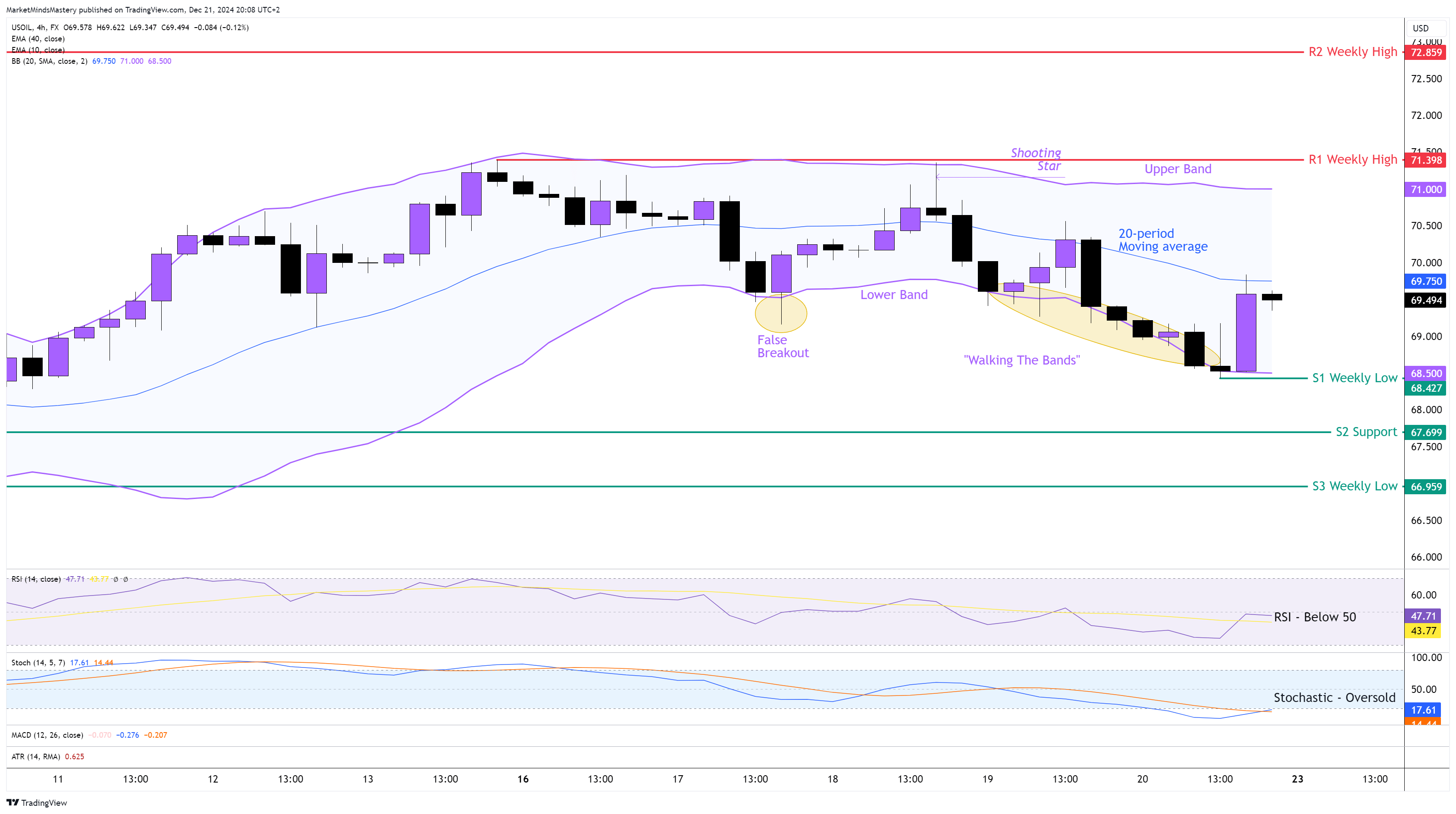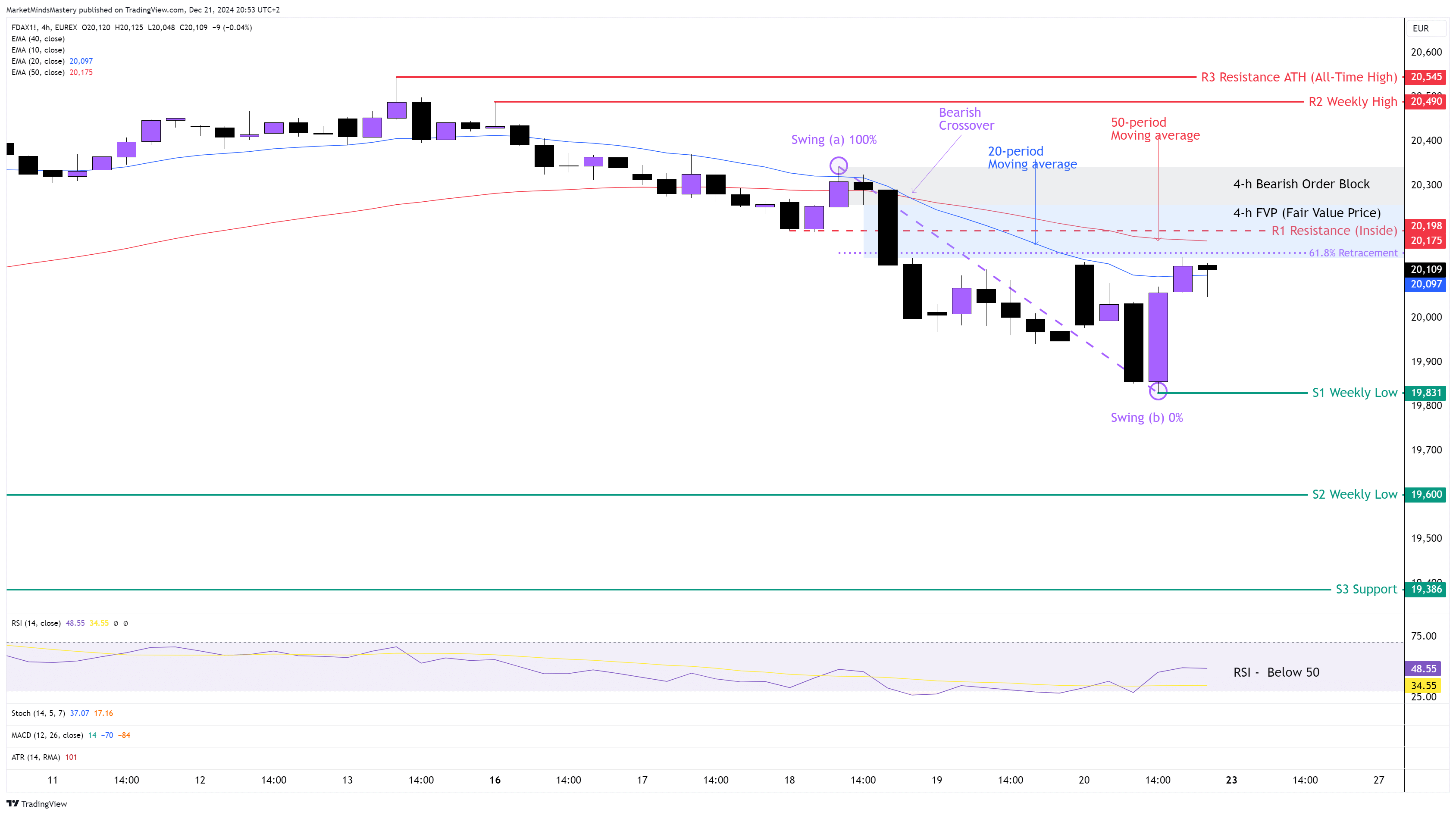 The Doji candle created the ATH (All-Time High) price on the weekly chart a few weeks ago, caused the price to decline last week, and created a Bearish candle on the weekly chart. As the primary trend is an uptrend, intraday downtrends need to be approached carefully. On the 4-hour chart, the price started making lower highs and lower lows. Last Wednesday, the price created a 4-hour Bearish Order Block around 20300 and an FVP (Fair Value Price) around 20150. Last Thursday, the 20-period crossed below the 50-period moving average, known as the Bearish Crossover. The RSI Oscillator is below its middle line of 50, and this has bearish implications. Starting Monday, if the price continues moving downwards, the first support area, S1, will be at 19831, which is the previous week’s low. If the price penetrates the S1 and keeps moving downwards, the next support area, S2, will be at 19600, which is an older weekly level.