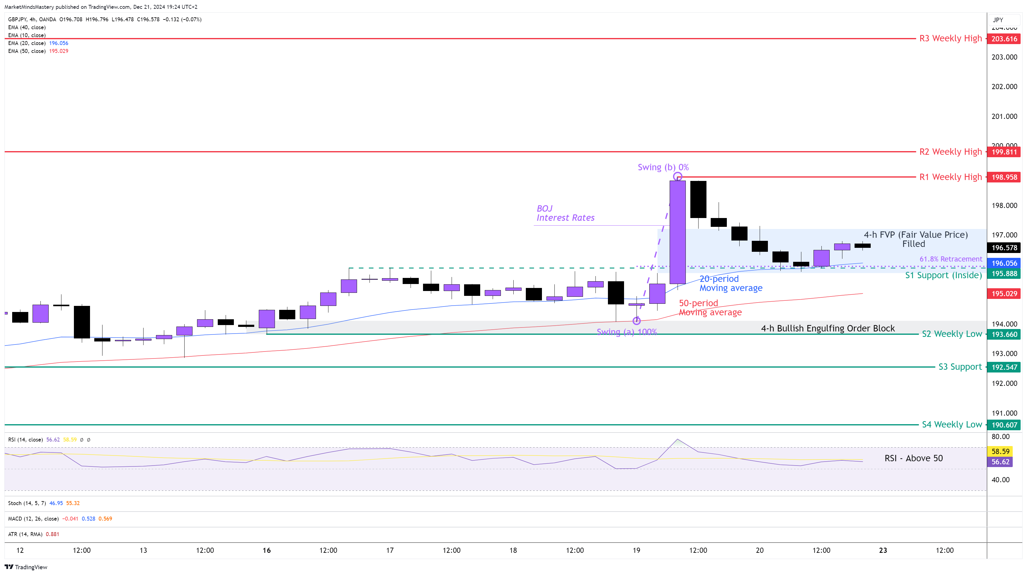 Following the previous week’s market analysis, the price of the GBPJPY has kept increasing, with the weekly chart’s candlestick ending as a Bullish Continuation. The 10-period remains above the 40-period weekly moving average (not shown on the chart), which has bullish implications. On the 4-hour chart, last Thursday, after the BOJ reported the new interest rates, the price of the GBPJPY skyrocketed by 3,500 points (350 pips), as shown on the chart. The price forms a higher high and a higher low formation, which is bullish. The 20-period is above the 50-period moving average, and this also has bullish implications. The RSI Oscillator is above its middle line of 50, indicating bullishness. Currently, the price is within the FVP (Fair Value Price) of around 197.000. Therefore, if the price keeps moving upwards, the first resistance area, R1, will be at 198.958, which is the previous week’s high. If the price penetrates the R1 and keeps increasing, the next resistance area, R2, will be around 199.811, which is an older weekly high. Conversely, if the price rejects and moves downwards, the first support area, S1, will be an Inside Support at 195.888. This is a key level of support as it consists of the FVP, the 20-period moving average, and the 61.8% Fibonacci Golden Ratio that is created if we measure the swing at point (a) until the swing at point (b). If the price penetrates the S1 and keeps moving downwards, the next support area, S2, will be around 193.660, which is the previous week’s low. The level coexists with a 4-h Bullish Engulfing Order Block and can become an additional supporting factor for the price. In case the price penetrates the S2 and keeps lowering, the next support area, S3, will be at 192.547.