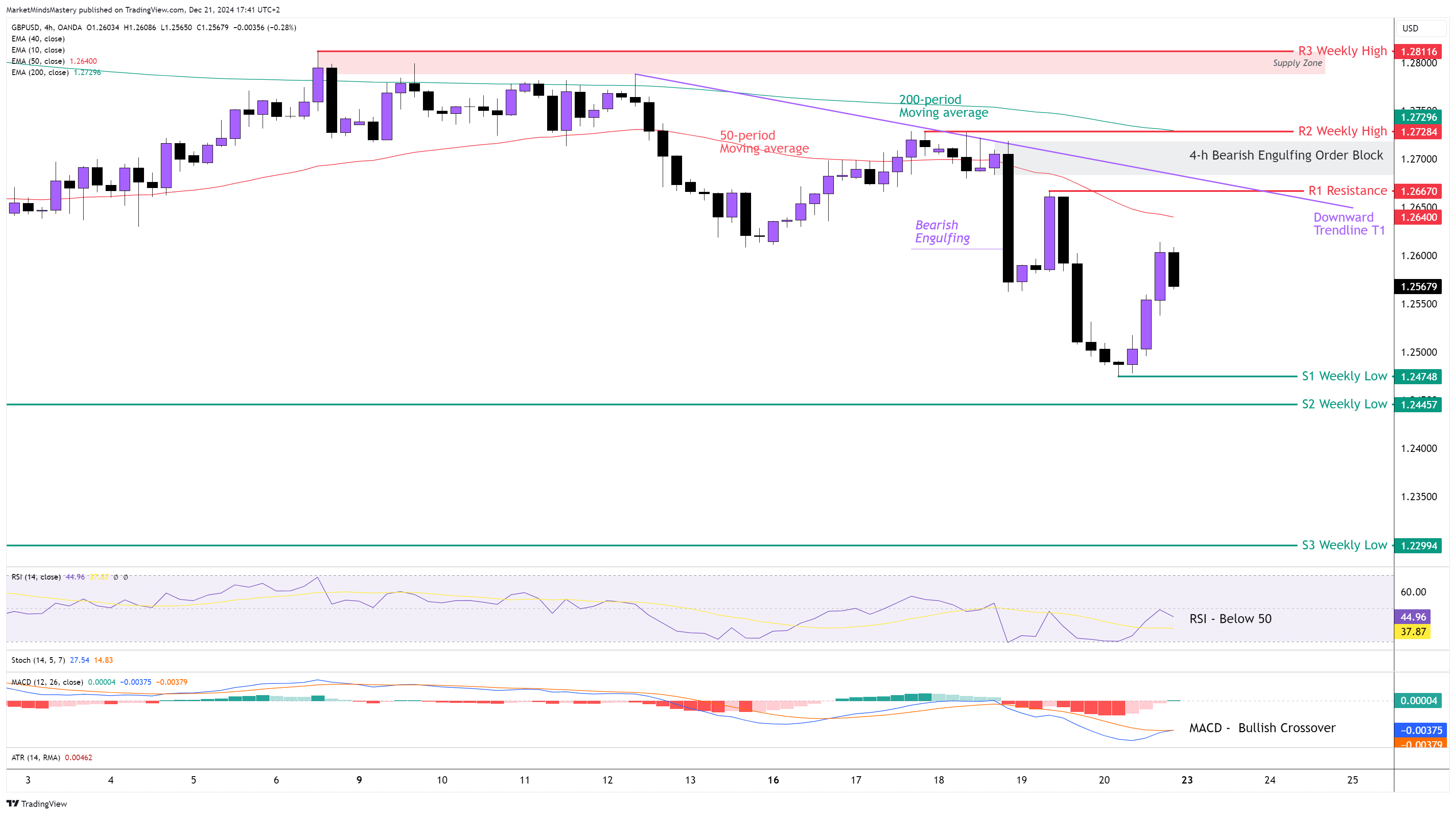 Following the previous week's market outlook, the weekly chart ended as a Long-Legged Dojy candle. Last week, we noticed the Great British Pound's weakness, and the drop in the value of the GBPUSD was expected. Moving into the 4-hour chart, the price kept making lower highs and lower lows. Last Wednesday, towards the end of the New York trading session, the price created a Bearish Engulfing candlestick that resulted in a new lower-low price formation and also a new market structure, with a 4-hour Bearish Engulfing Order Block around 1.27000. Sterling's weakness continued until Friday, with the price making a new lower low and lower high, as shown on the chart. Therefore, we could draw a Downward Trendline T1. The 50-period moving average is below the 200-period moving average, which is bearish. The RSI Oscillator is below 50, and this has bearish implications. Although the MACD is below zero, the MACD Line (Blue) crosses above the Signal Line (Orange), creating a bullish crossover. These can cause the price to start a retracement phase.